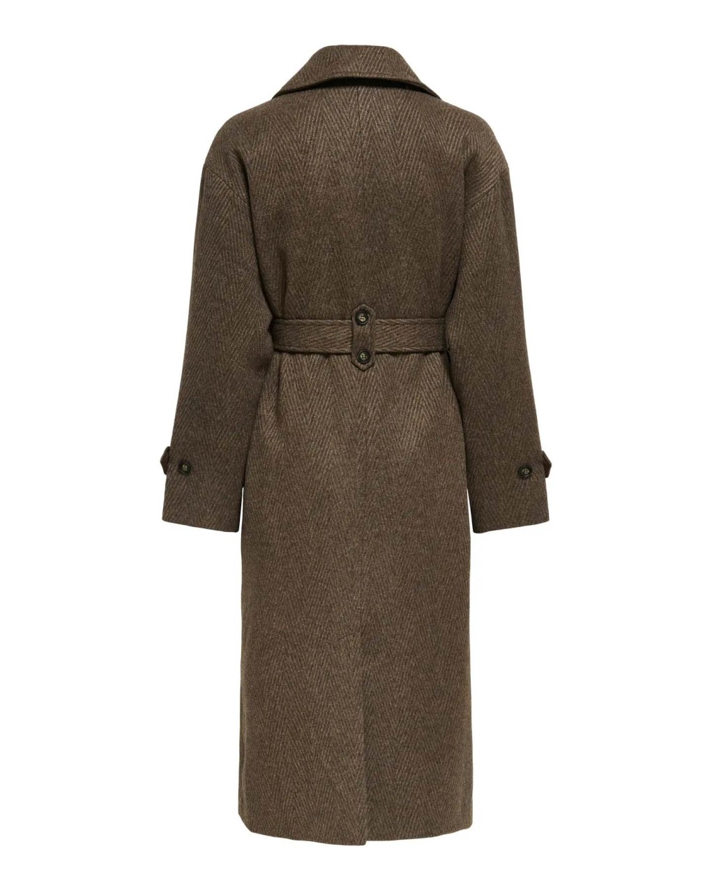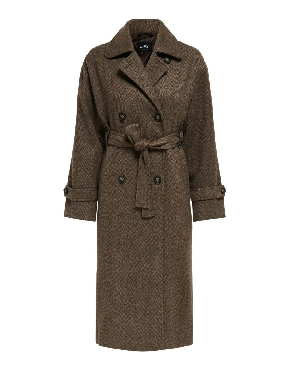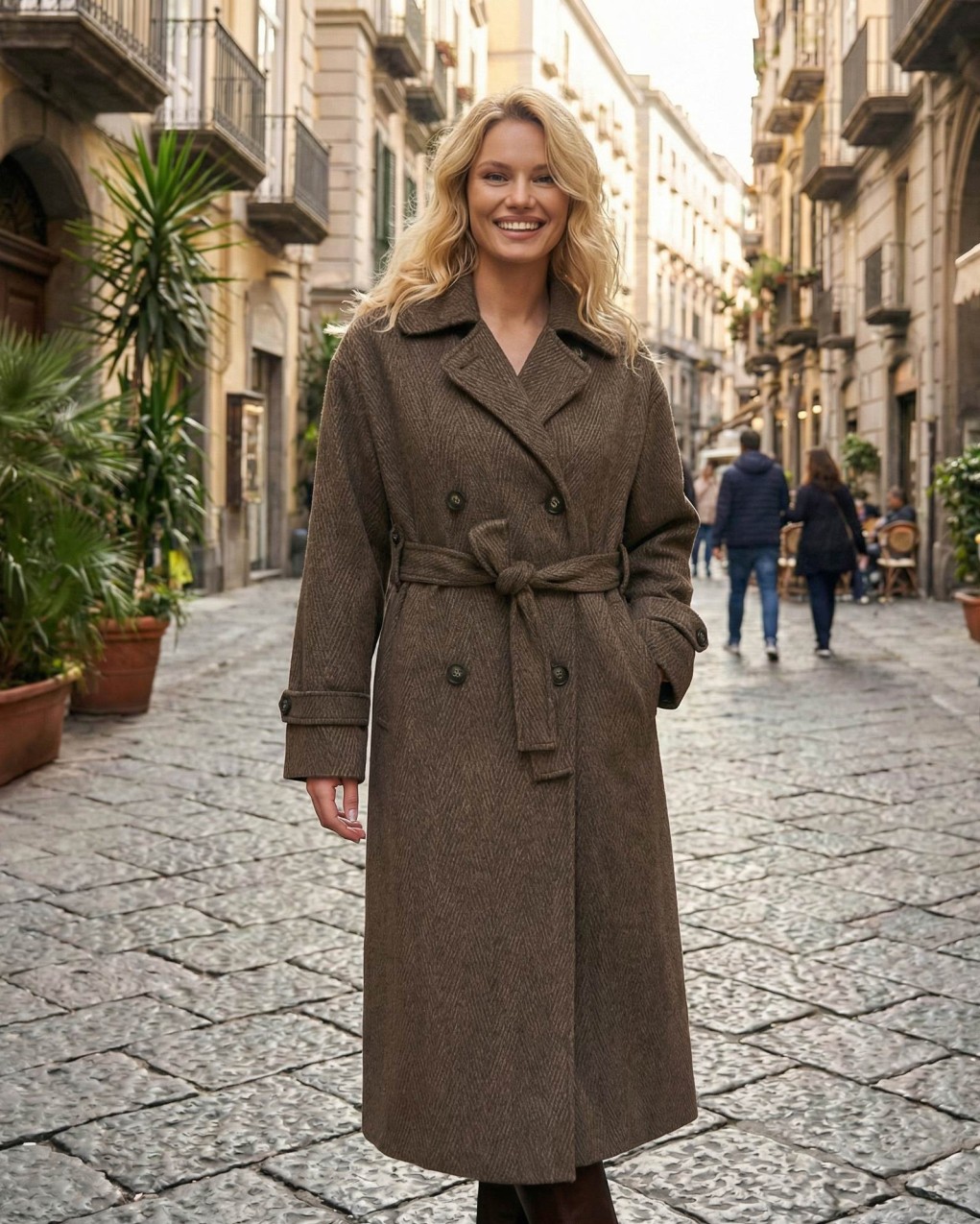 Cappotto lungo doppiopetto dallo stile classico e senza tempo, perfetto per la stagione fredda. Realizzato in tessuto con elegante motivo a spina di pesce, presenta revers strutturati, doppia abbottonatura e cintura in vita per definire la silhouette. Il taglio lungo e la vestibilità regolare garantiscono un look sofisticato e una protezione ottimale dalle intemperie. Ideale per outfit formali ed eleganti da città.