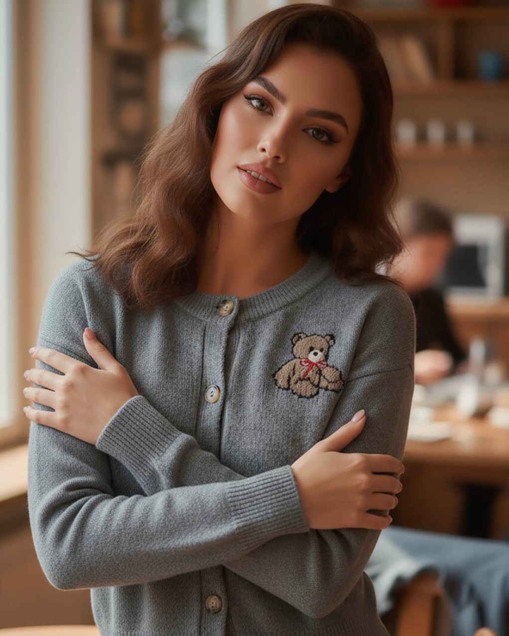 Maglione cropped in morbida lana con delizioso motivo orsetto intarsiato sul retro. Il design presenta un orso teddy con fiocchetto decorativo, realizzato con tecnica jacquard per una resa di alta qualità. Vestibilità corta e leggermente oversize, perfetta per un look casual-chic, con polsini e bordi a costine per una silhouette definita.