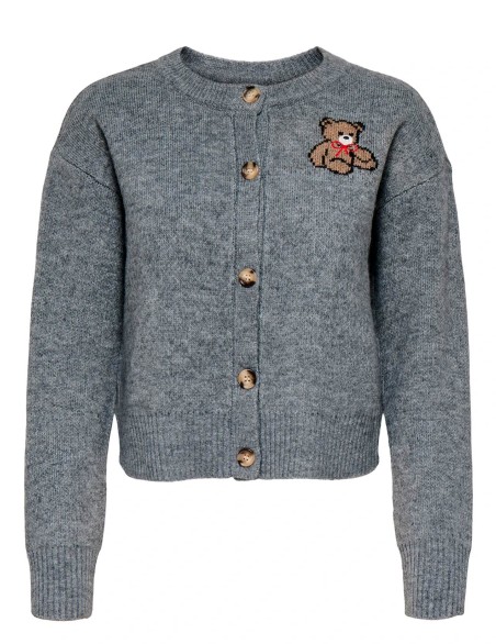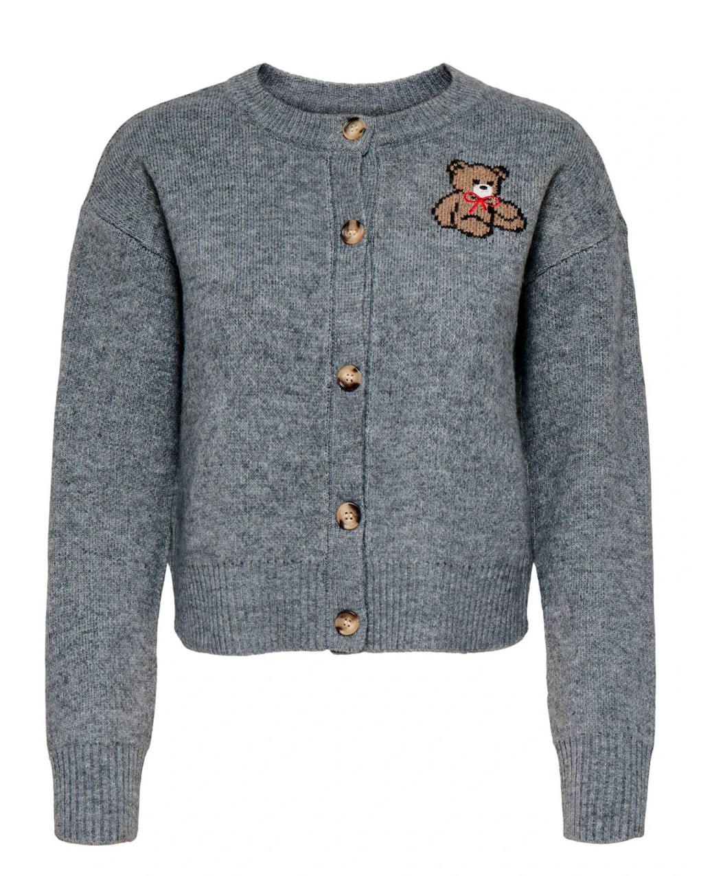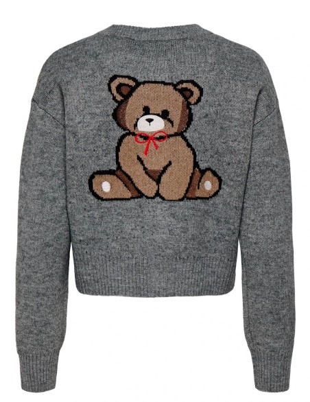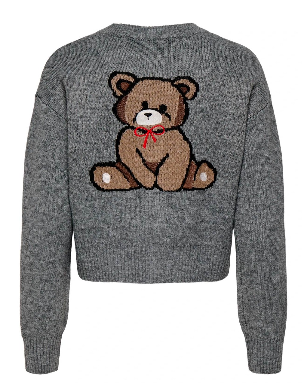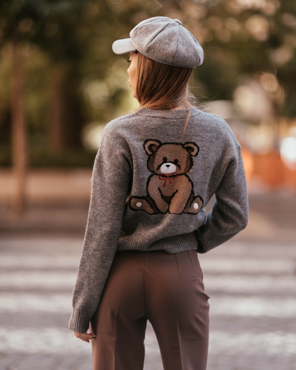 Maglione cropped in morbida lana con delizioso motivo orsetto intarsiato sul retro. Il design presenta un orso teddy con fiocchetto decorativo, realizzato con tecnica jacquard per una resa di alta qualità. Vestibilità corta e leggermente oversize, perfetta per un look casual-chic, con polsini e bordi a costine per una silhouette definita.