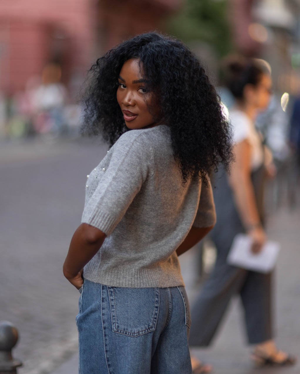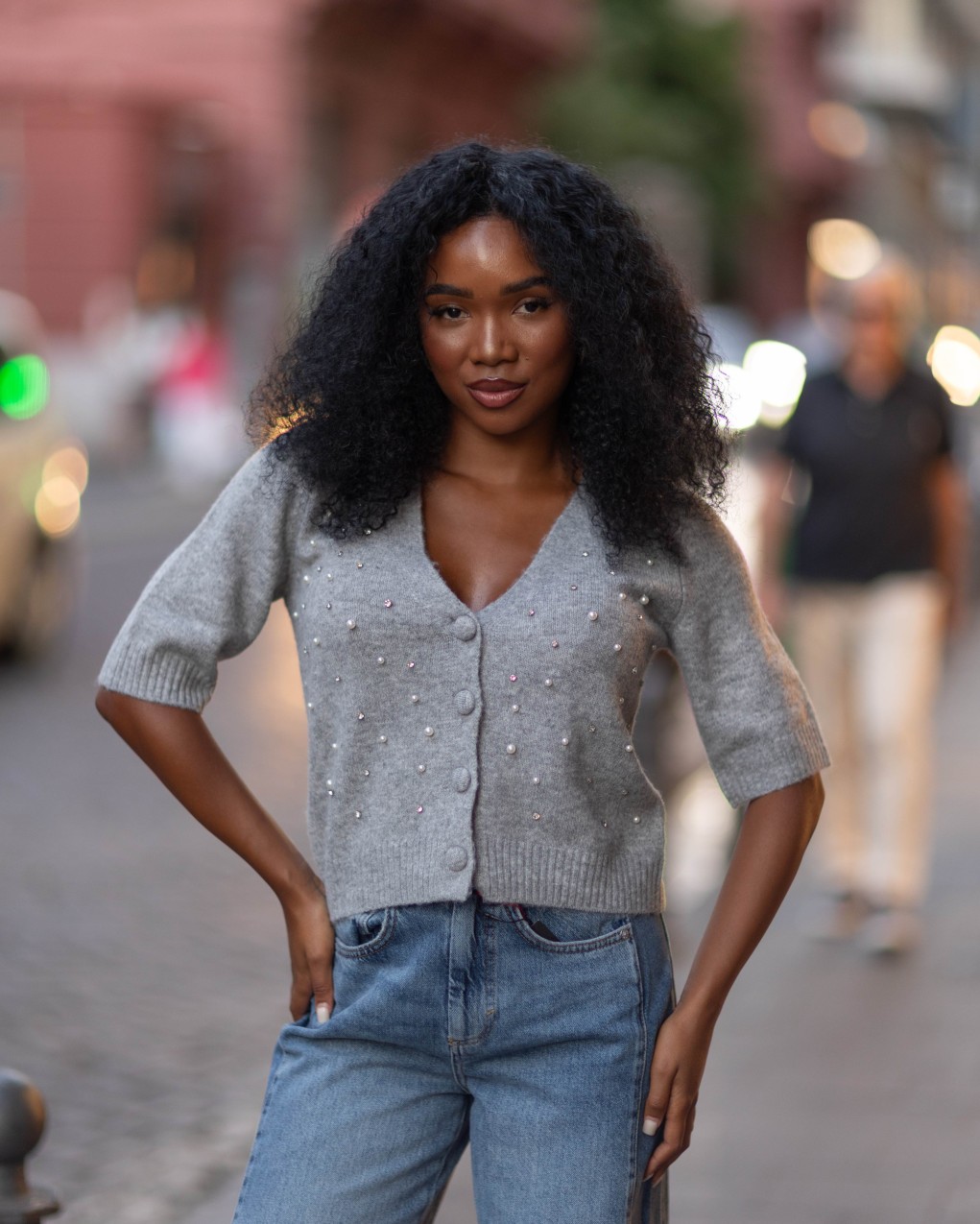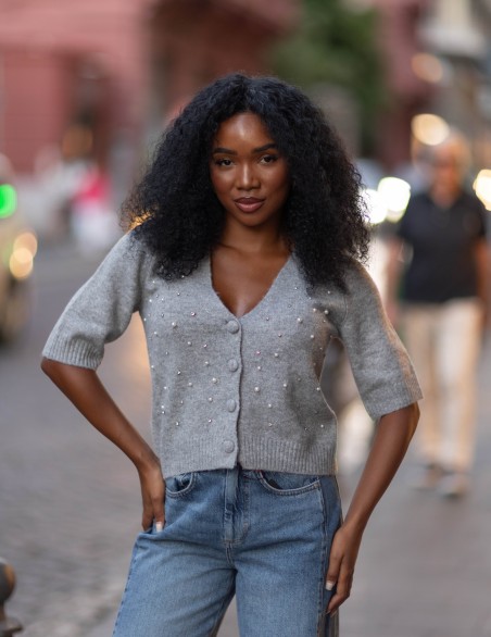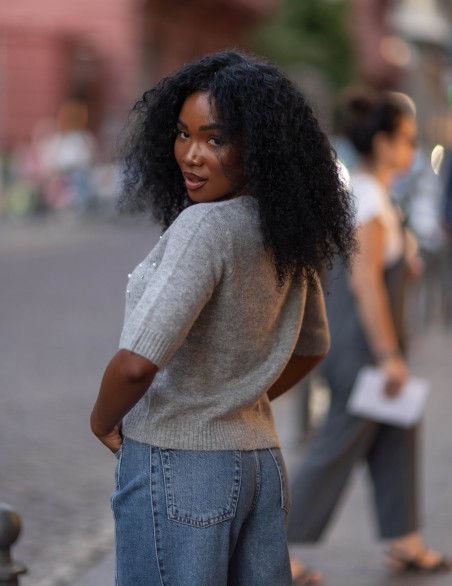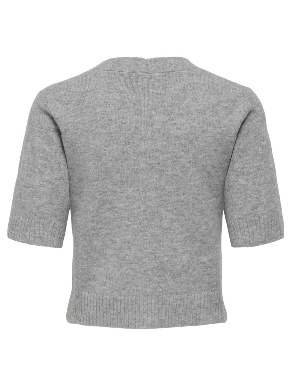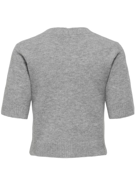 Maglioncino corto a maniche corte in morbida lana mista, caratterizzato da una vestibilità moderna e aderente. Il design essenziale presenta bordi a coste sul fondo e sulle maniche, mentre il girocollo classico ne esalta la versatilità. Ideale per look stratificati, questo capo basic si adatta perfettamente a ogni tipo di outfit, dalla mattina alla sera.