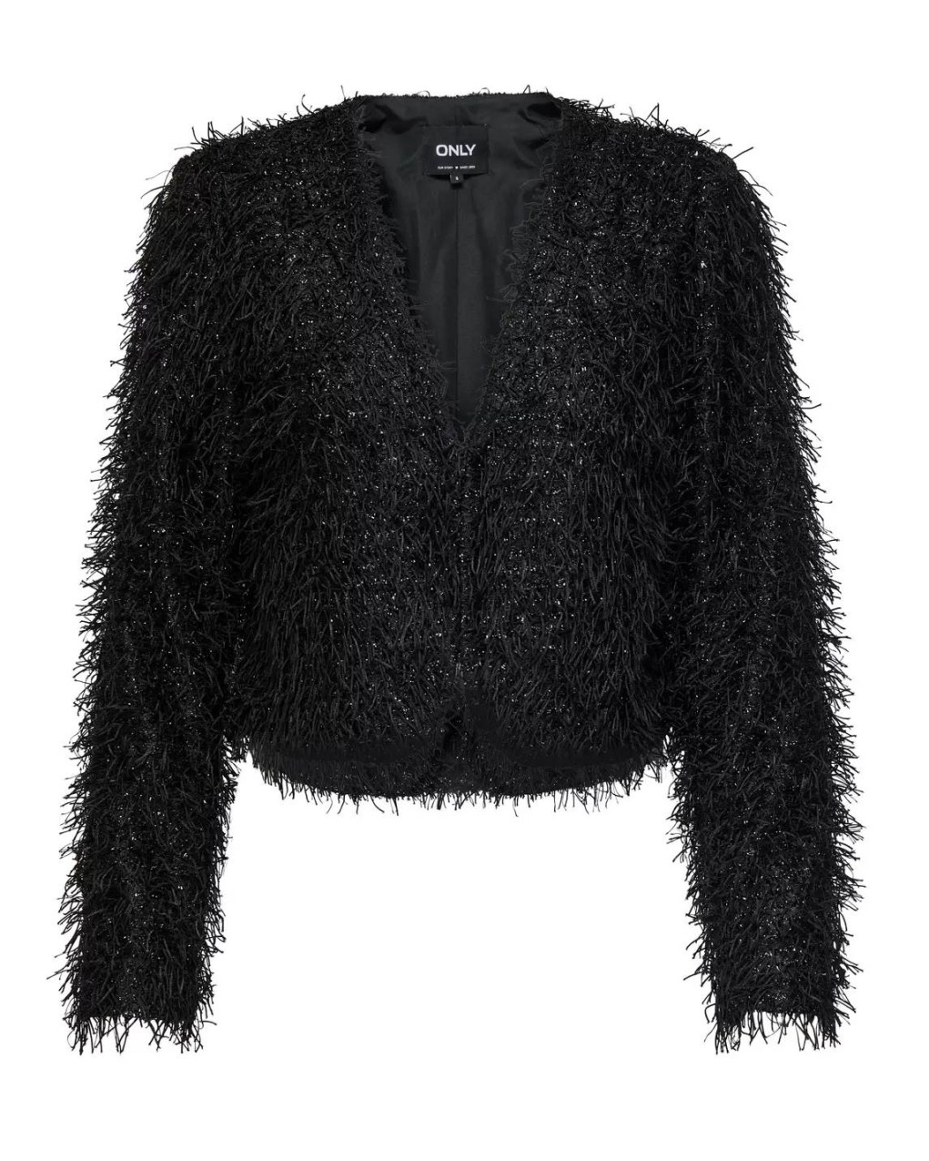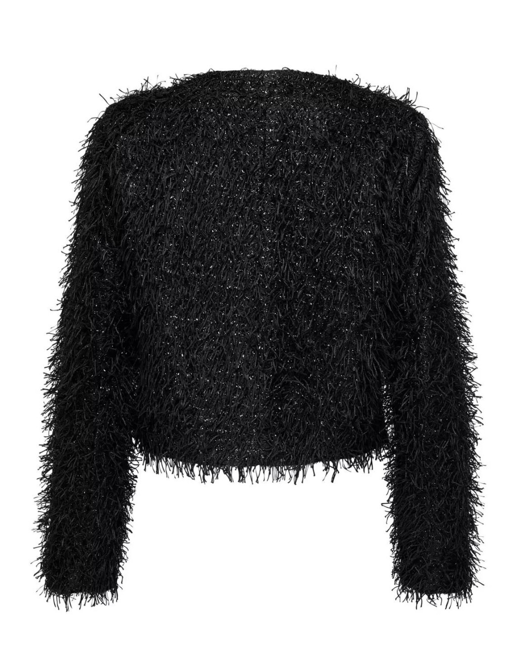 Cardigan perfetto per occasioni serali ed eventi speciali. Il design presenta una silhouette crop con scollo a V e chiusura frontale, realizzata in materiale sintetico di alta qualità per un look lussuoso e contemporaneo. La vestibilità aderente e la lunghezza cropped si abbinano perfettamente a pantaloni a vita alta, creando un ensemble sofisticato e alla moda.