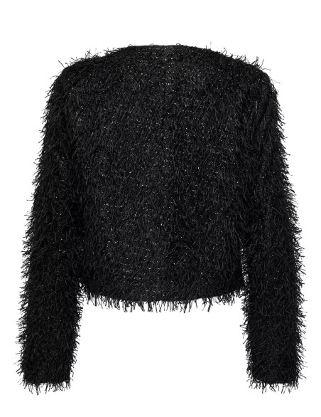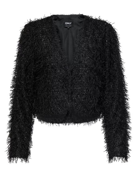 Cardigan perfetto per occasioni serali ed eventi speciali. Il design presenta una silhouette crop con scollo a V e chiusura frontale, realizzata in materiale sintetico di alta qualità per un look lussuoso e contemporaneo. La vestibilità aderente e la lunghezza cropped si abbinano perfettamente a pantaloni a vita alta, creando un ensemble sofisticato e alla moda.