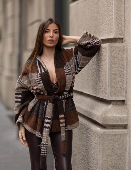 Cardigan oversize in morbida lana con motivo geometrico intrecciato, caratterizzato da una silhouette avvolgente e maniche ampie. La cintura in vita definisce la figura, mentre il taglio lungo e la lavorazione a maglia pesante garantiscono comfort e calore. Perfetto per uno stile casual-chic, si abbina facilmente sia a look casual che più eleganti.