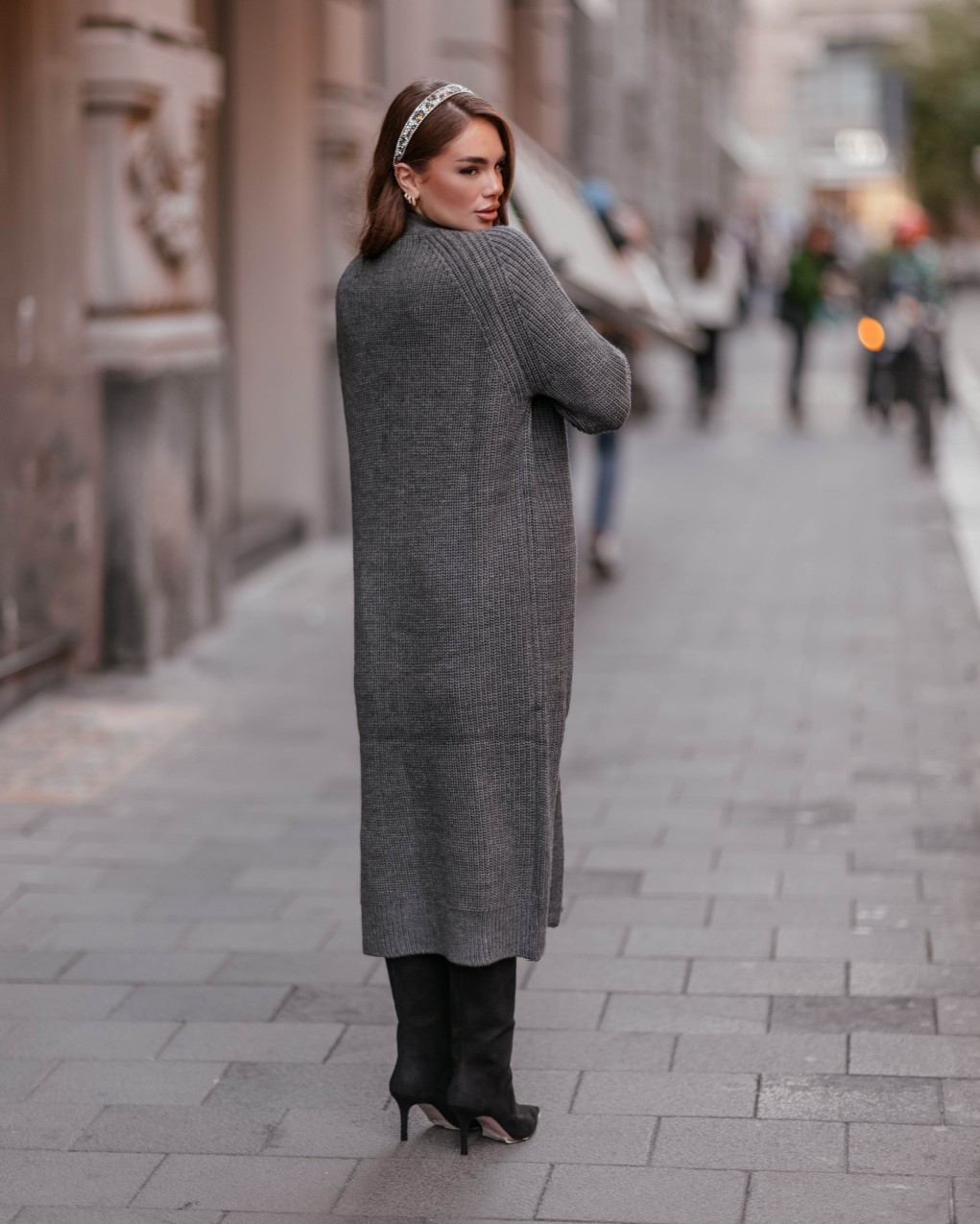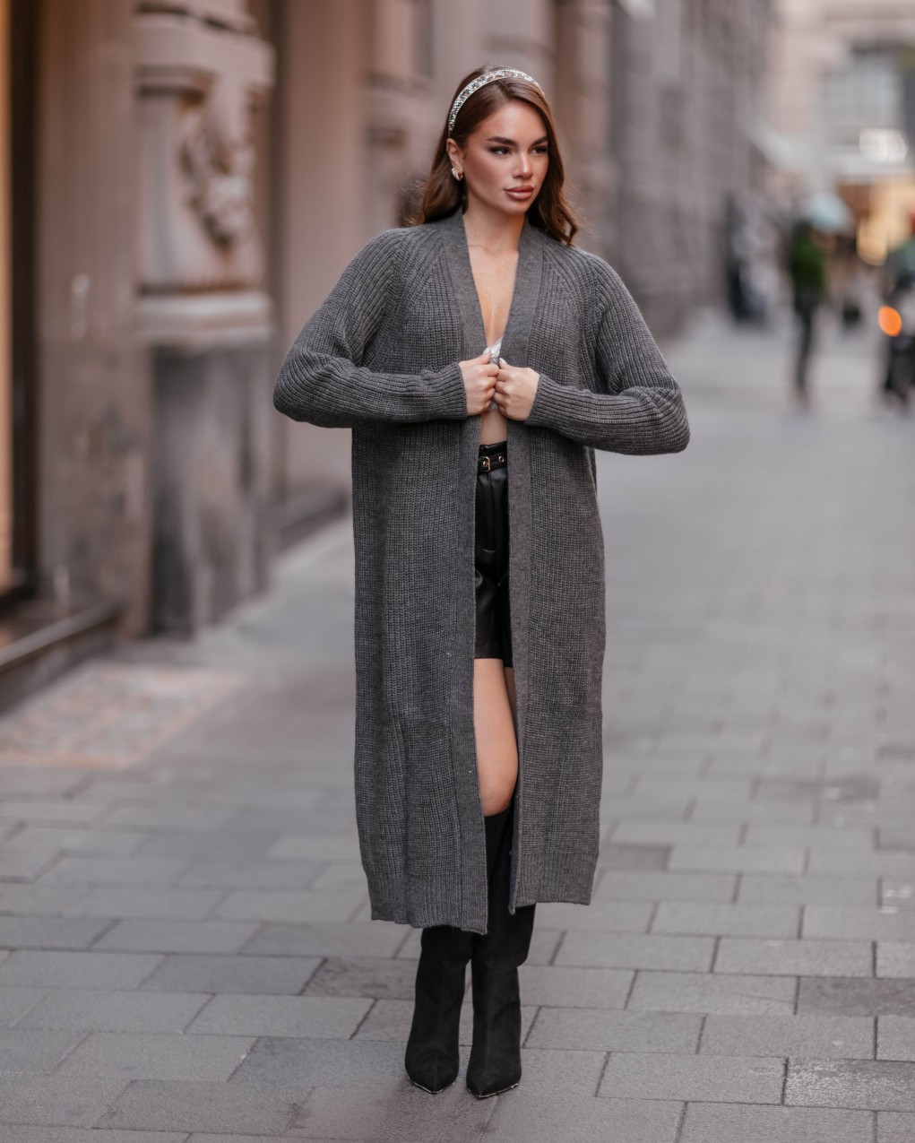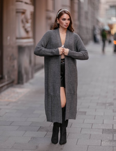 Cardigan lungo in maglia pesante realizzato in filato di lana misto acrilico, caratterizzato da una lavorazione a coste verticali che crea un effetto texture elegante e avvolgente. Il taglio oversize e la silhouette allungata lo rendono perfetto per look a strati, mentre l'assenza di bottoni e il design minimal ne esaltano la versatilità. La vestibilità comoda e la lunghezza midi si adattano perfettamente a diverse corporature e occasioni d'uso.