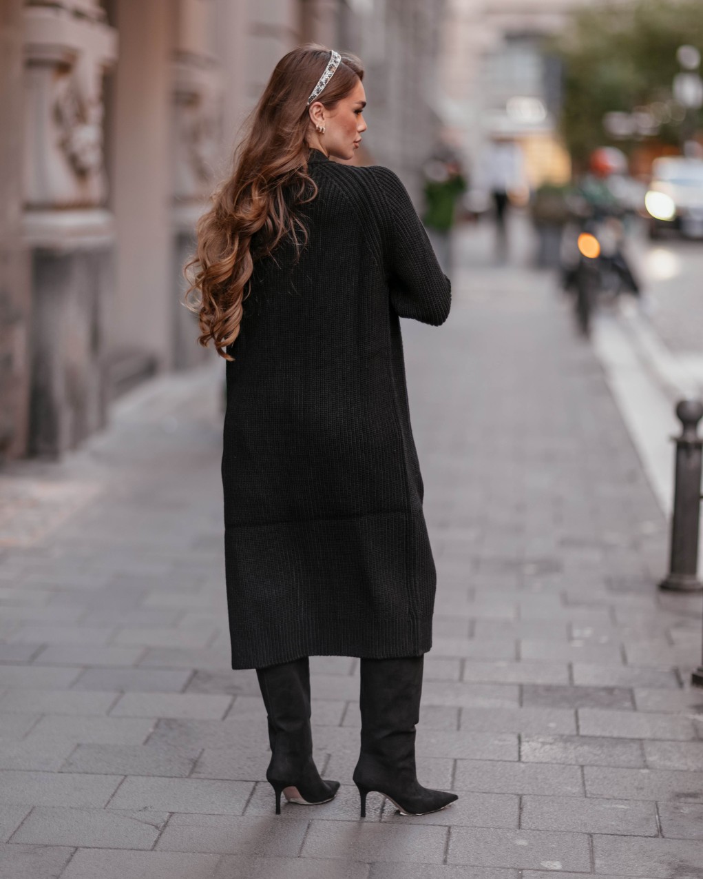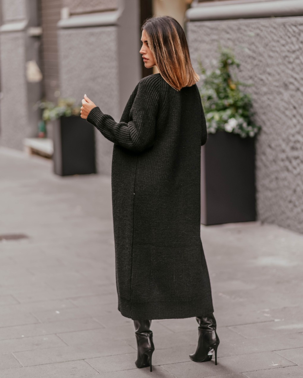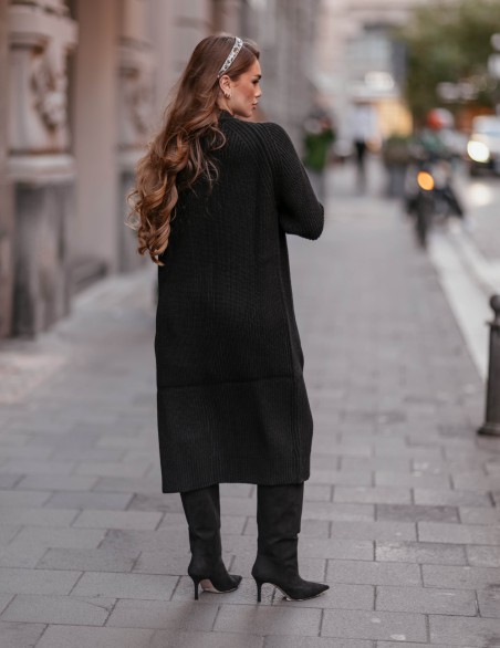 Cardigan lungo in maglia pesante realizzato in filato di lana misto acrilico, caratterizzato da una lavorazione a coste verticali che crea un effetto texture elegante e avvolgente. Il taglio oversize e la silhouette allungata lo rendono perfetto per look a strati, mentre l'assenza di bottoni e il design minimal ne esaltano la versatilità. La vestibilità comoda e la lunghezza midi si adattano perfettamente a diverse corporature e occasioni d'uso.
