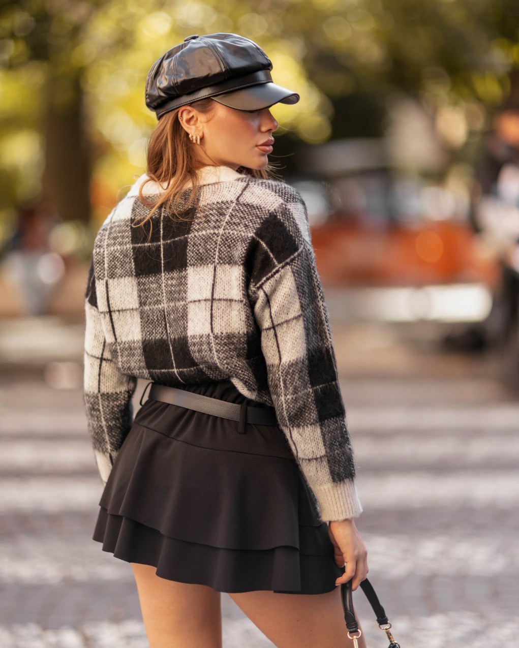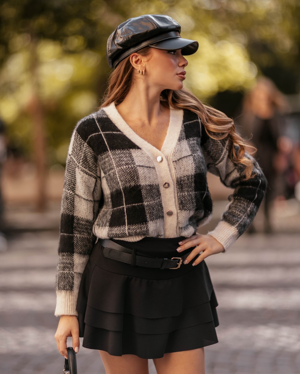 Un capo elegante e contemporaneo, caratterizzato da motivo a quadri e bottoni oro che aggiungono un tocco di raffinatezza. Perfetto da indossare da solo o sopra camicie e bluse per look sofisticati e moderni.