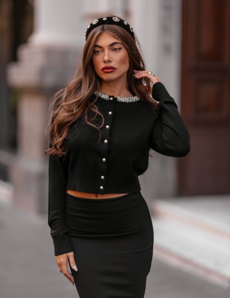 Look perfetto con questo raffinato cardigan cropped. Il tessuto morbido e la vestibilità moderna si uniscono a un tocco di eleganza dato dal colletto impreziosito da perle e dai bottoni perlati. Ottimo per un outfit sofisticato, da abbinare a gonne a vita alta o pantaloni sartoriali.