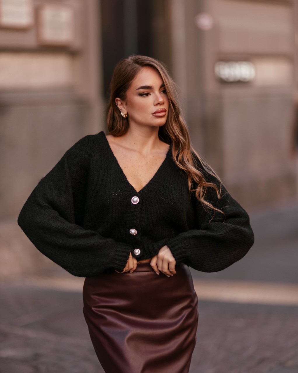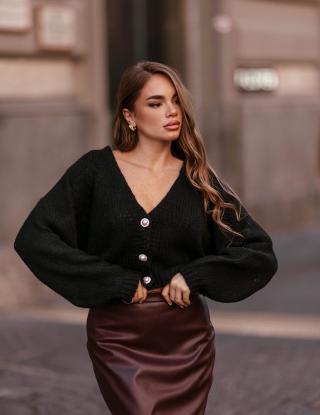 Cardigan corto in maglia con scollo a V profondo e chiusura frontale con bottoni decorativi. Il design presenta maniche a palloncino voluminose che conferiscono un look femminile e contemporaneo. Realizzato in tessuto lavorato a maglia morbido e confortevole, ideale per la mezza stagione. La vestibilità è regolare con lunghezza cropped che valorizza la silhouette.