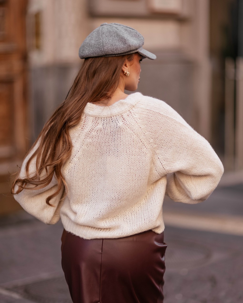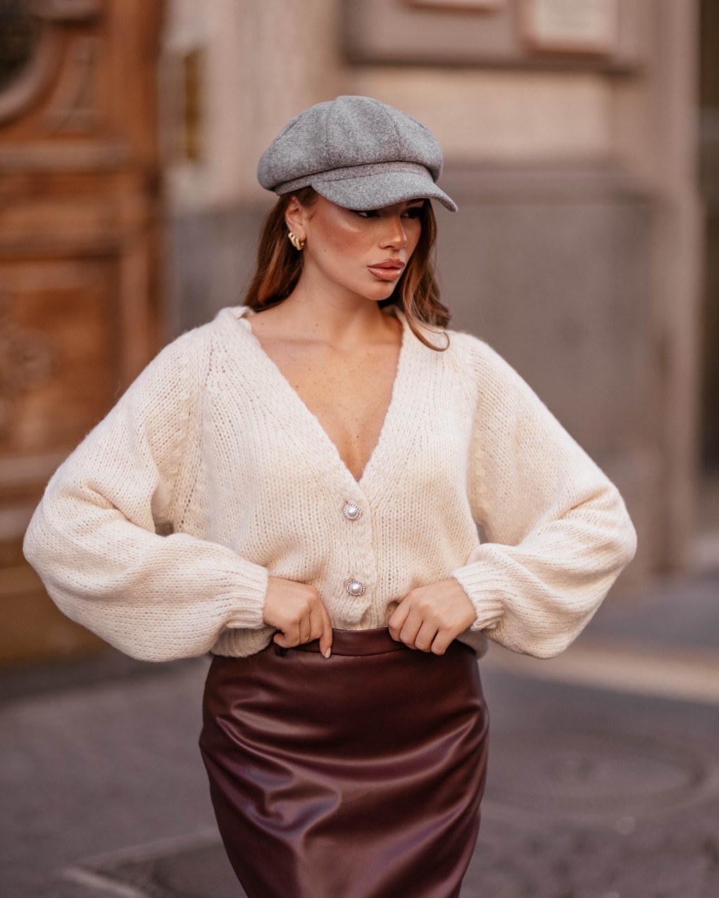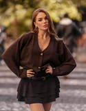 Cardigan corto in maglia con scollo a V profondo e chiusura frontale con bottoni decorativi. Il design presenta maniche a palloncino voluminose che conferiscono un look femminile e contemporaneo. Realizzato in tessuto lavorato a maglia morbido e confortevole, ideale per la mezza stagione. La vestibilità è regolare con lunghezza cropped che valorizza la silhouette.