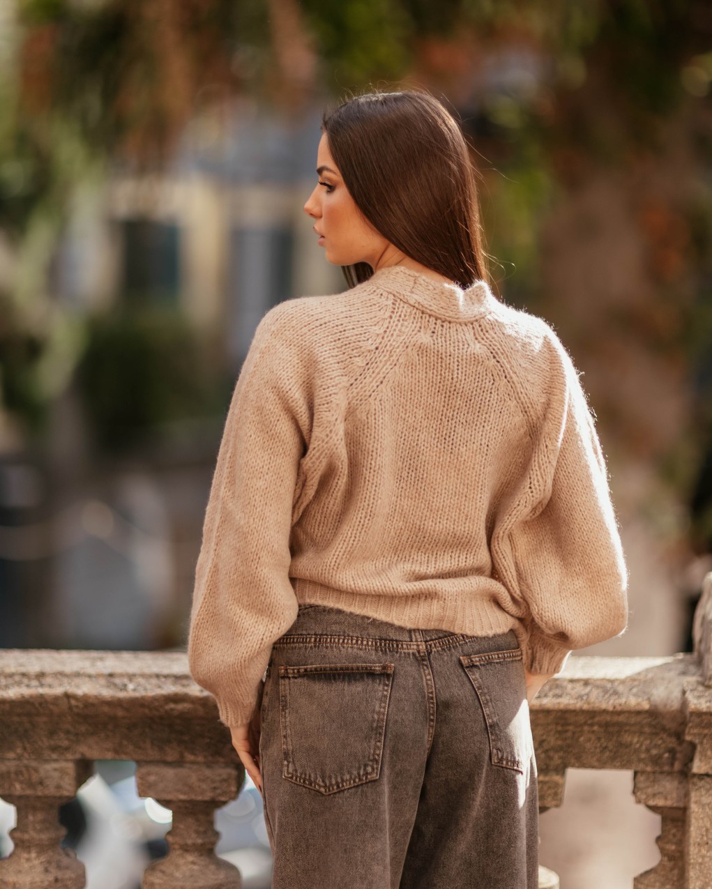 Cardigan corto in maglia con scollo a V profondo e chiusura frontale con bottoni decorativi. Il design presenta maniche a palloncino voluminose che conferiscono un look femminile e contemporaneo. Realizzato in tessuto lavorato a maglia morbido e confortevole, ideale per la mezza stagione. La vestibilità è regolare con lunghezza cropped che valorizza la silhouette.