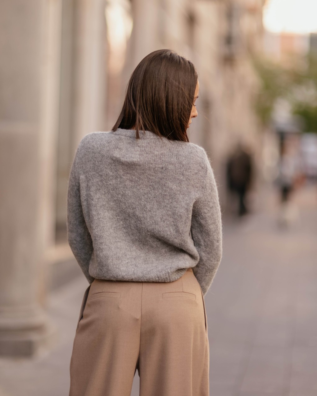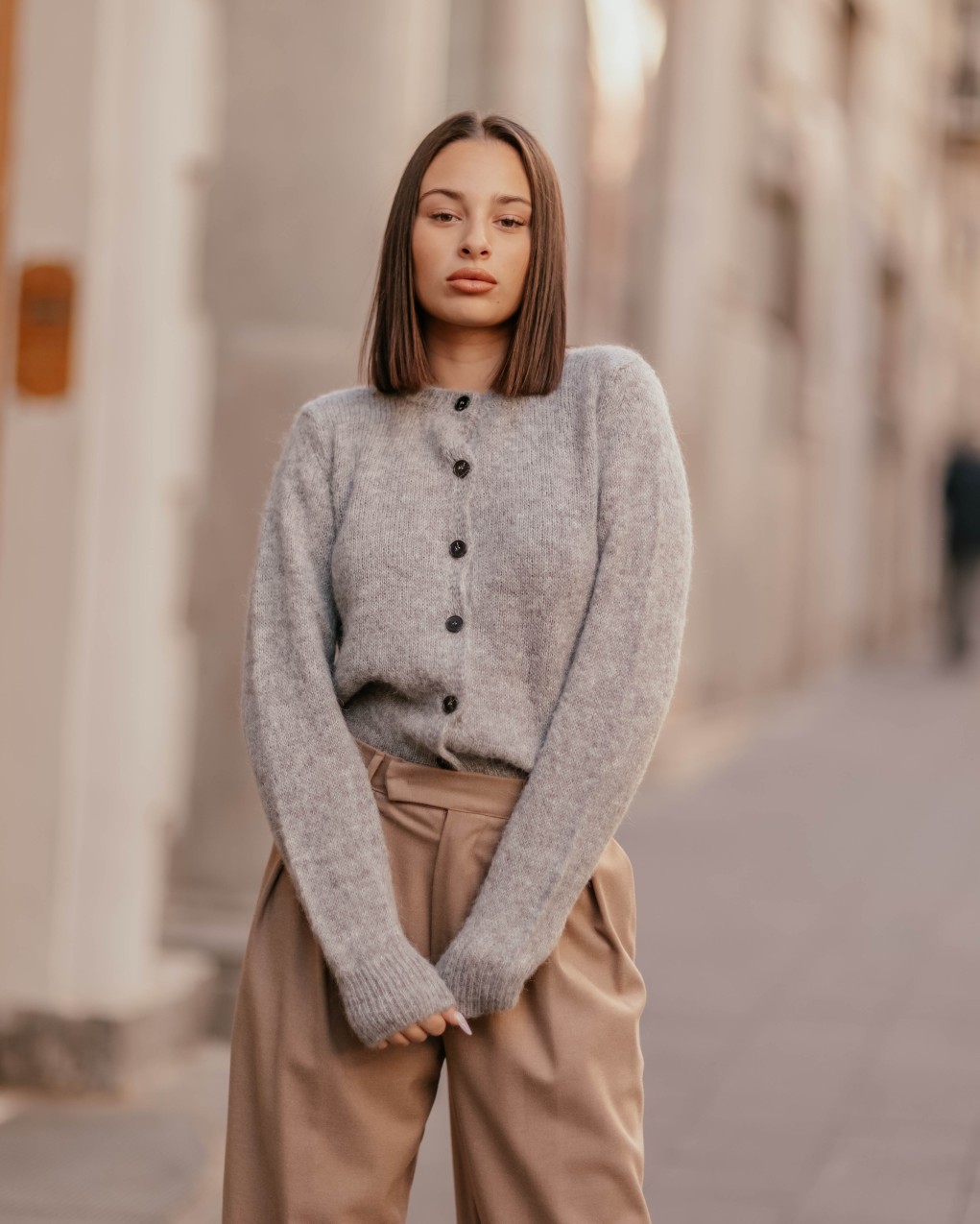Cardigan in maglia morbida dallo stile minimalista e raffinato, perfetto per la stagione intermedia. Realizzato in filato pregiato, presenta una chiusura frontale con bottoni decorativi e girocollo classico. La vestibilità è regolare e confortevole, con maniche lunghe dal taglio essenziale. Un capo versatile che si adatta facilmente a look casual ed eleganti, ideale per completare outfit da giorno e da ufficio.