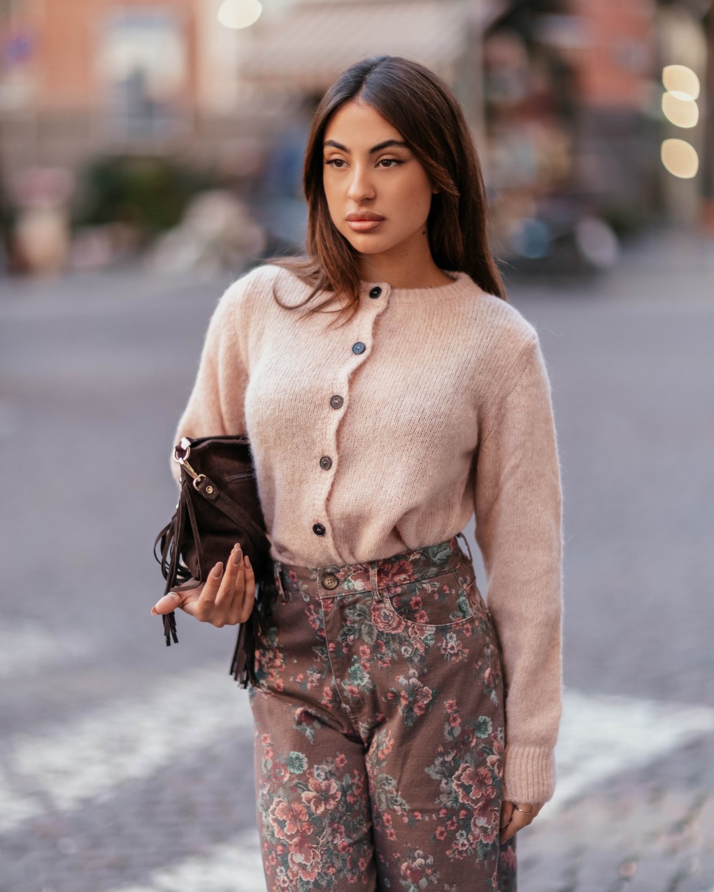 Cardigan in maglia morbida dallo stile minimalista e raffinato, perfetto per la stagione intermedia. Realizzato in filato pregiato, presenta una chiusura frontale con bottoni decorativi e girocollo classico. La vestibilità è regolare e confortevole, con maniche lunghe dal taglio essenziale. Un capo versatile che si adatta facilmente a look casual ed eleganti, ideale per completare outfit da giorno e da ufficio.