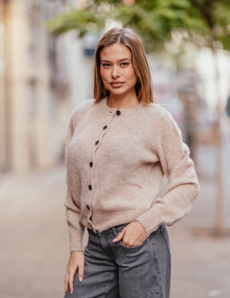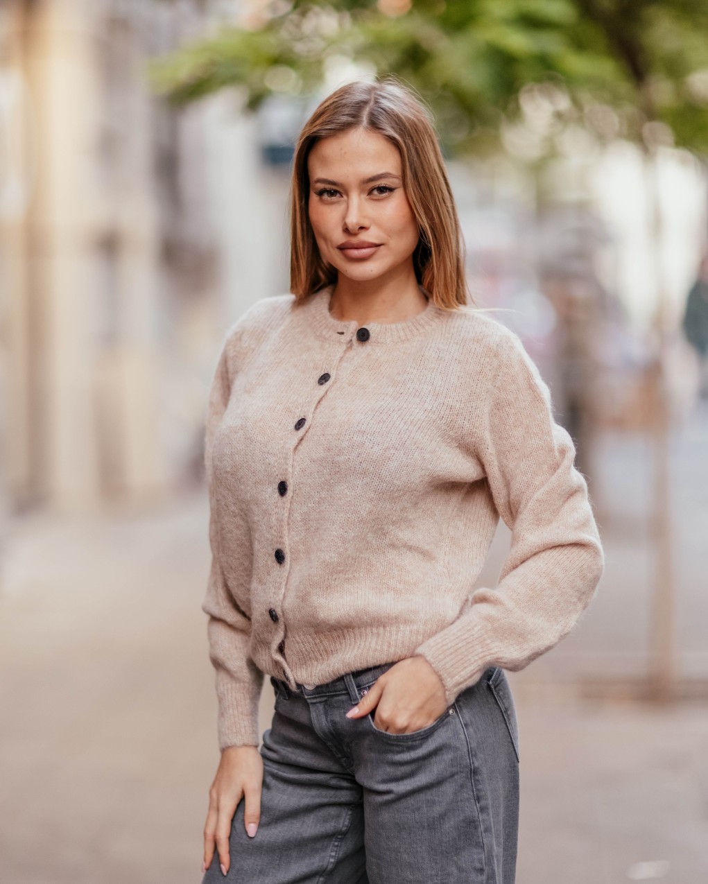 Cardigan in maglia morbida dallo stile minimalista e raffinato, perfetto per la stagione intermedia. Realizzato in filato pregiato, presenta una chiusura frontale con bottoni decorativi e girocollo classico. La vestibilità è regolare e confortevole, con maniche lunghe dal taglio essenziale. Un capo versatile che si adatta facilmente a look casual ed eleganti, ideale per completare outfit da giorno e da ufficio.