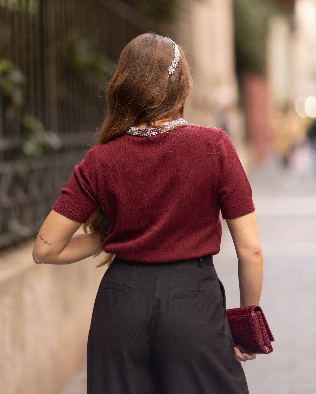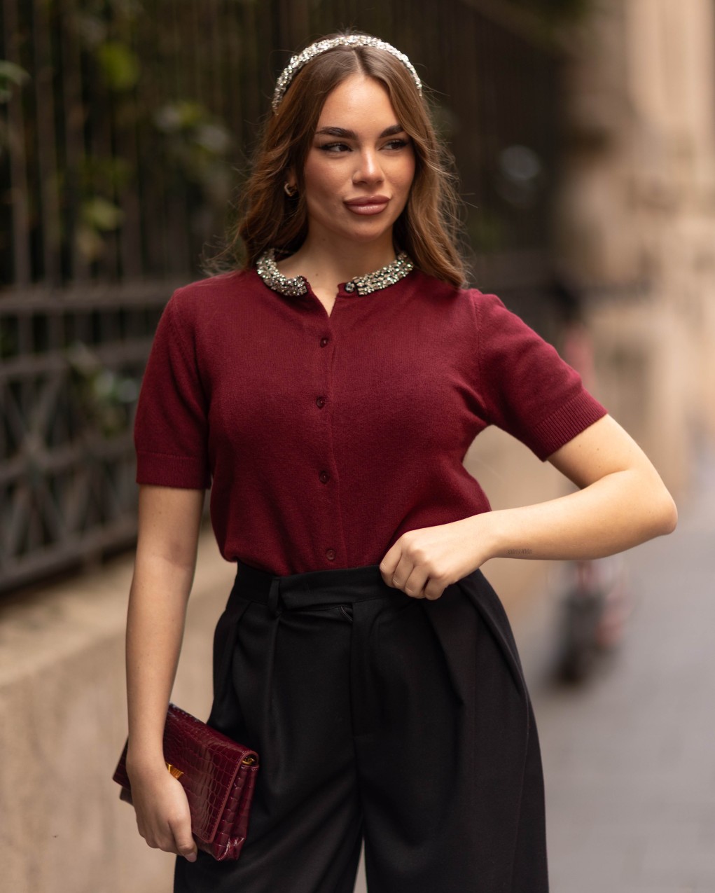 Cardigan a maniche corte in maglia fine dallo stile elegante e raffinato, impreziosito da un colletto decorato con applicazioni di perle e cristalli. Realizzato in morbido tessuto a maglia, presenta chiusura frontale con bottoni tono su tono e costine alle maniche. La vestibilità è regolare e confortevole, perfetta per look sia casual che formali. Un capo versatile che aggiunge un tocco di classe ed eleganza a qualsiasi outfit.
