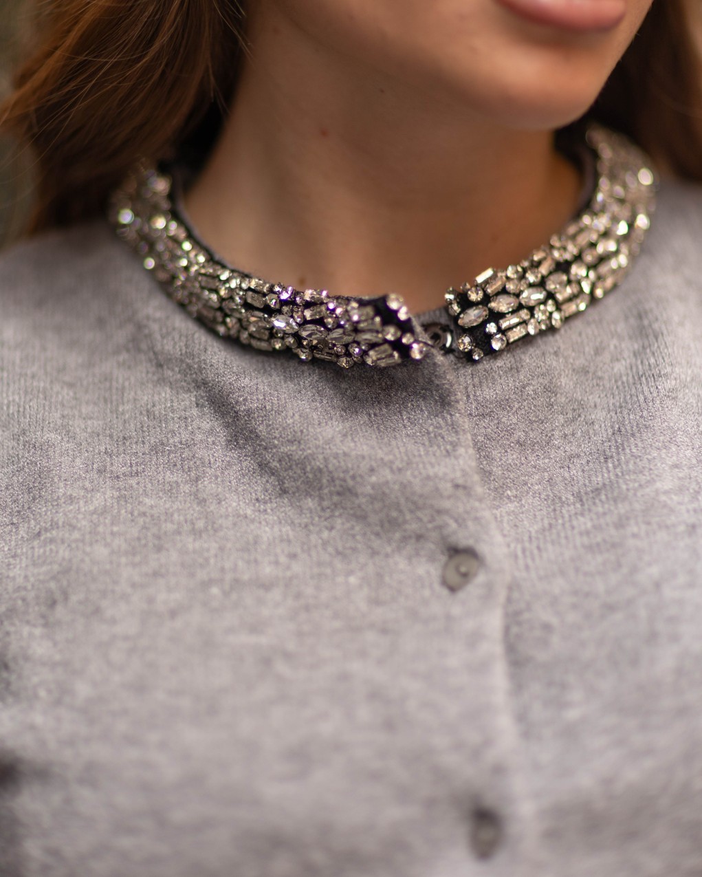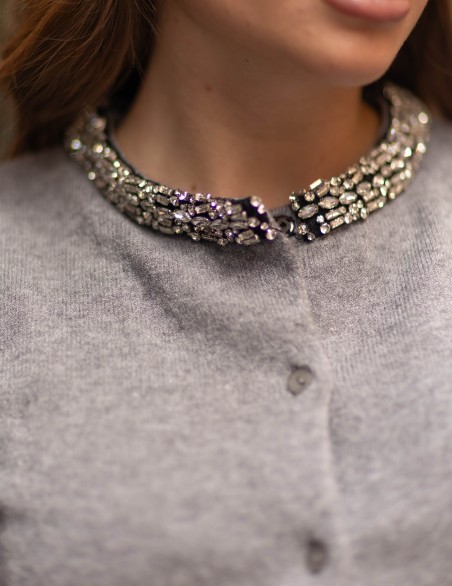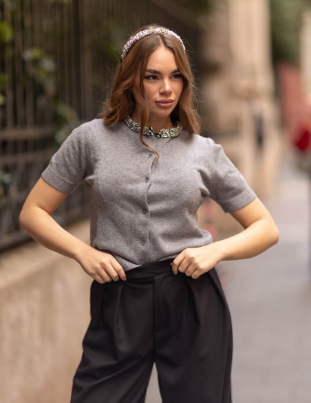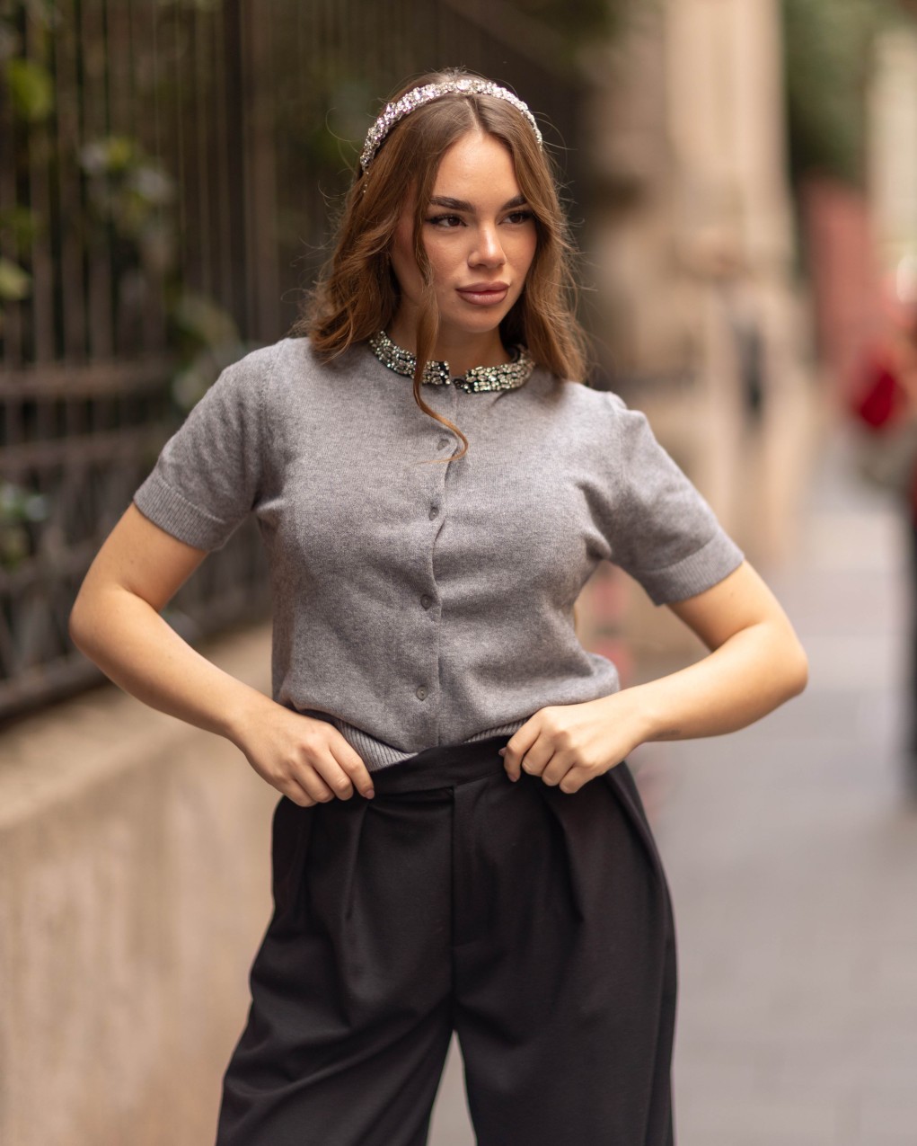 Cardigan a maniche corte in maglia fine dallo stile elegante e raffinato, impreziosito da un colletto decorato con applicazioni di perle e cristalli. Realizzato in morbido tessuto a maglia, presenta chiusura frontale con bottoni tono su tono e costine alle maniche. La vestibilità è regolare e confortevole, perfetta per look sia casual che formali. Un capo versatile che aggiunge un tocco di classe ed eleganza a qualsiasi outfit.