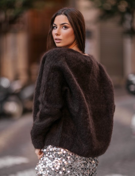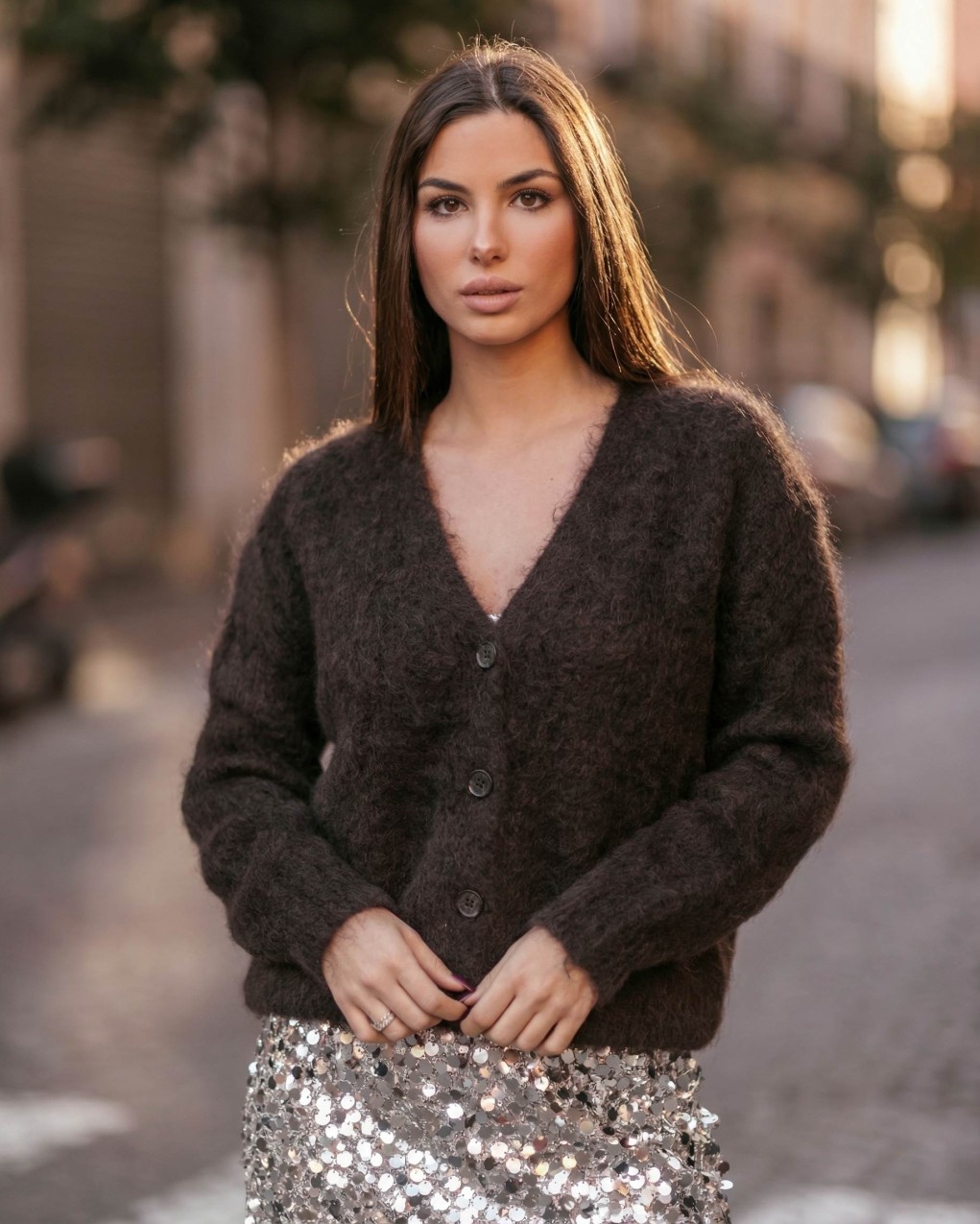 Cardigan in morbida maglia effetto mohair dallo stile elegante e contemporaneo. Realizzato in filato soffice e caldo, presenta chiusura frontale con bottoni e scollo a V profondo. La vestibilità è regular e rilassata, perfetta per essere indossato sia chiuso che aperto su abiti da sera o look casual-chic. Capo versatile ideale per la mezza stagione e i mesi invernali, abbinabile a outfit formali ed informali.