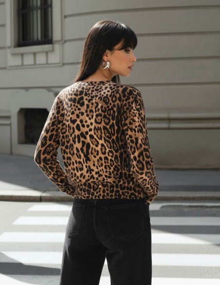 Maglia a manica lunga con stampa animalier leopardata, perfetta per uno stile casual-chic contemporaneo. Presenta girocollo con elastico decorativo, vestibilità comoda e leggermente oversize che garantisce libertà di movimento. Realizzata in morbido tessuto confortevole, ideale per la vita quotidiana e abbinamenti versatili. Il design trendy con pattern iconico la rende un capo statement essenziale per ogni guardaroba moderno.