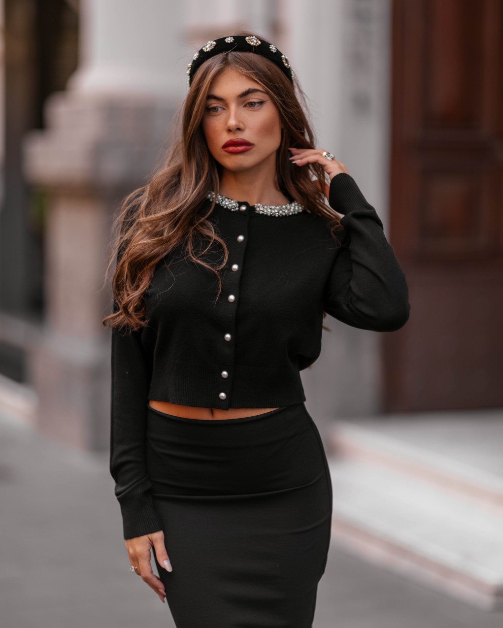 Look perfetto con questo raffinato cardigan cropped. Il tessuto morbido e la vestibilità moderna si uniscono a un tocco di eleganza dato dal colletto impreziosito da perle e dai bottoni perlati. Ottimo per un outfit sofisticato, da abbinare a gonne a vita alta o pantaloni sartoriali.