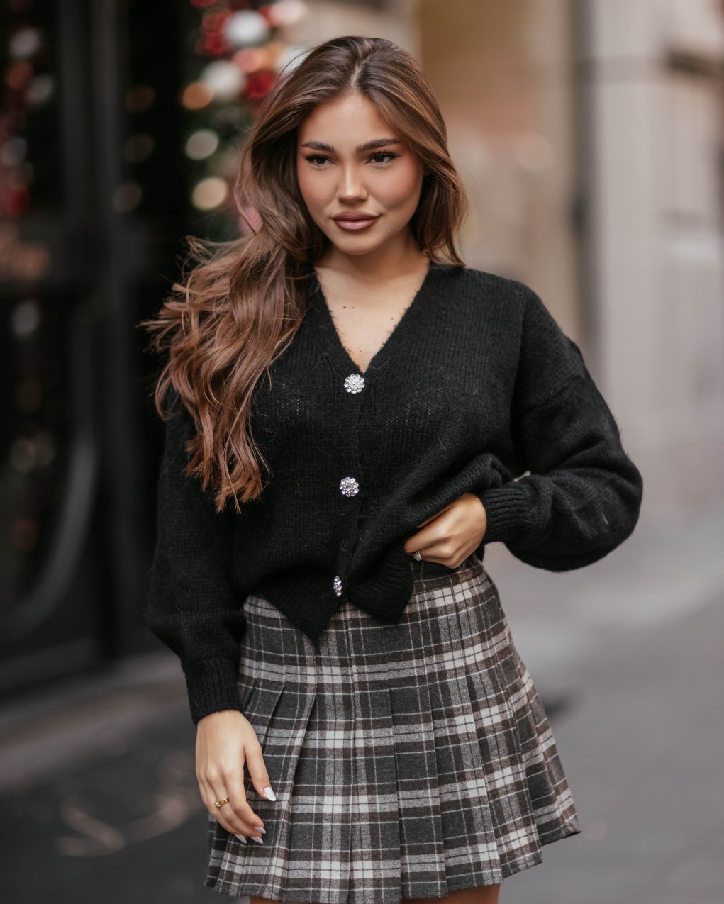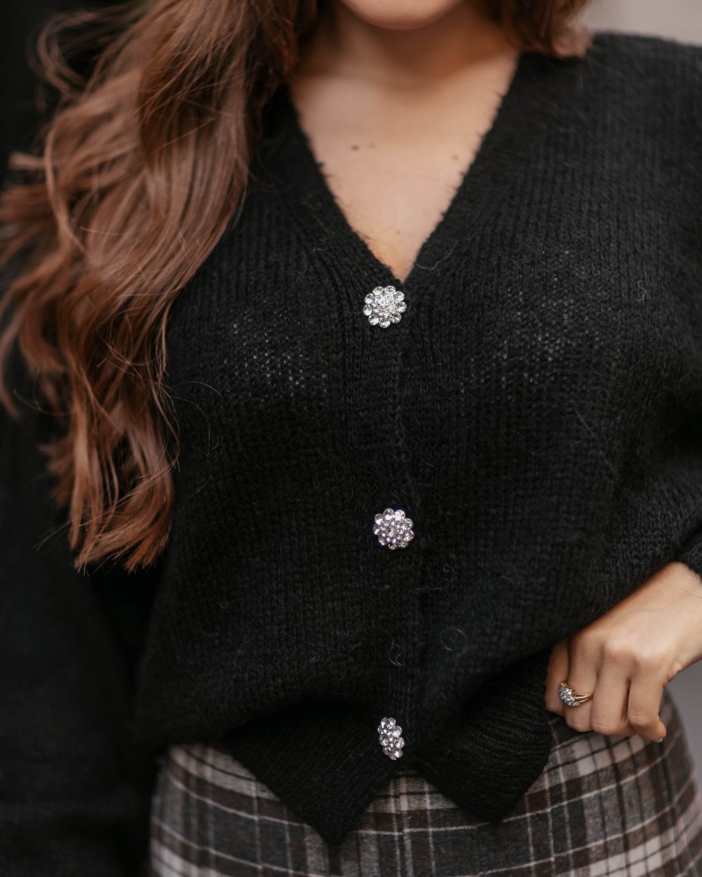 Cardigan corto in maglia con scollo a V e chiusura frontale con bottoni gioiello decorativi. Realizzato in tessuto morbido e confortevole, presenta maniche lunghe leggermente voluminose per un look contemporaneo e femminile. La vestibilità è regular con lunghezza corta che termina in vita, ideale da abbinare a gonne o pantaloni a vita alta. Un capo versatile perfetto per completare outfit sia casual che eleganti.