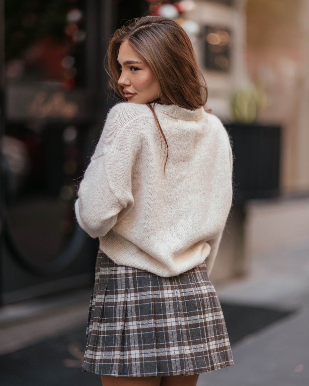 Cardigan corto in maglia con scollo a V e chiusura frontale con bottoni gioiello decorativi. Realizzato in tessuto morbido e confortevole, presenta maniche lunghe leggermente voluminose per un look contemporaneo e femminile. La vestibilità è regular con lunghezza corta che termina in vita, ideale da abbinare a gonne o pantaloni a vita alta. Un capo versatile perfetto per completare outfit sia casual che eleganti.