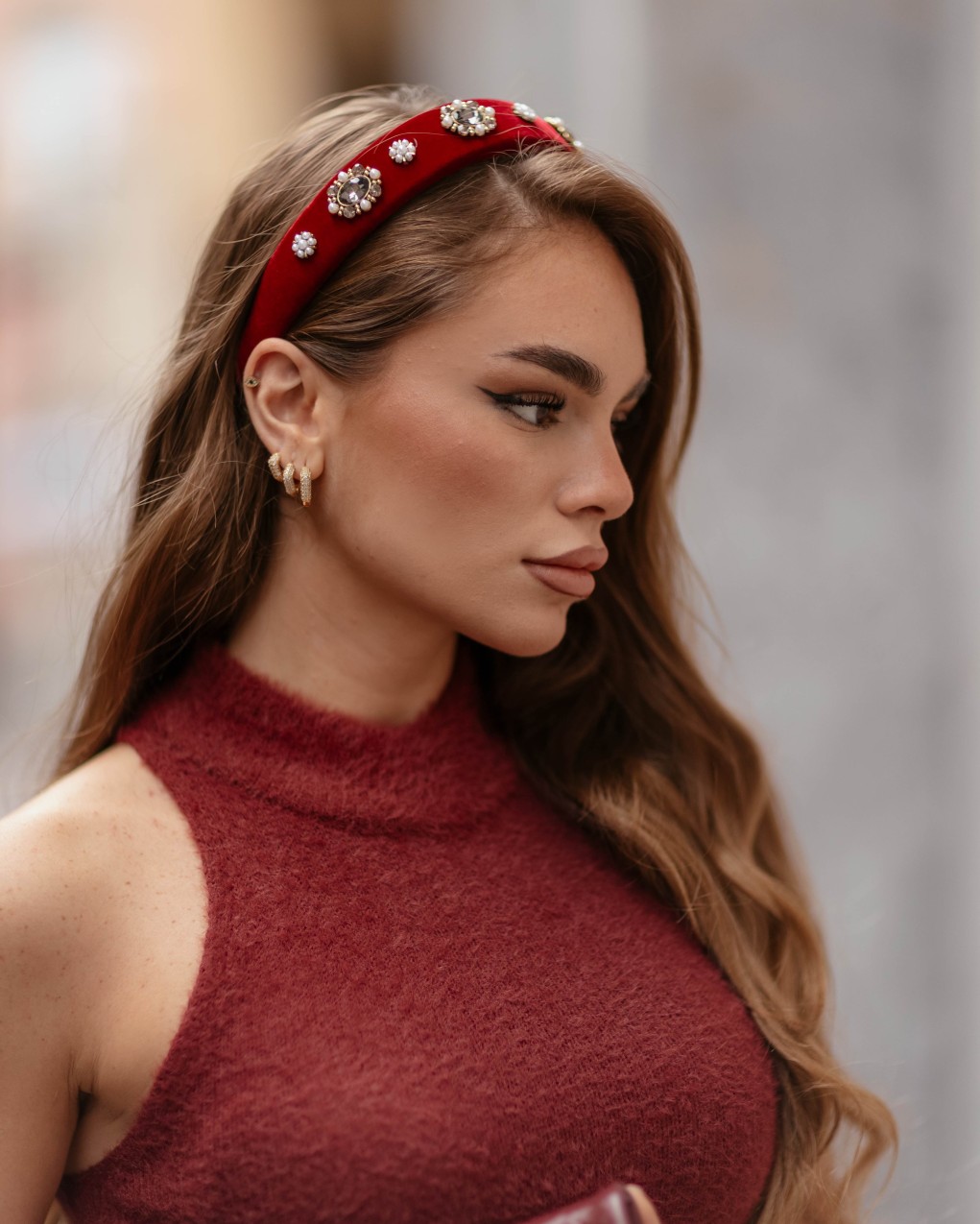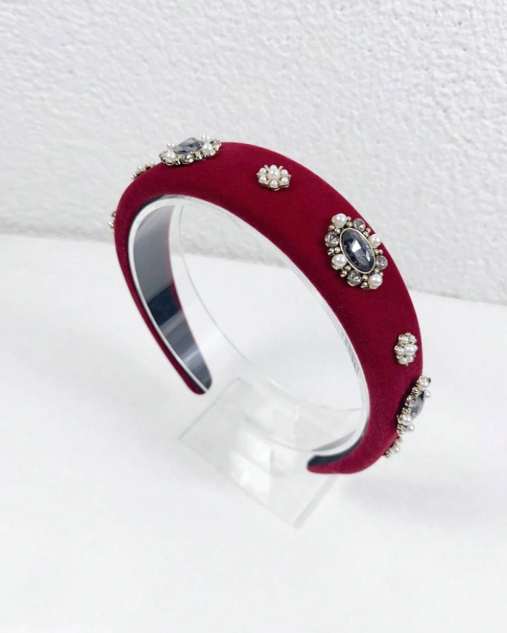 Elegante cerchietto in velluto impreziosito da raffinati decori gioiello in stile vintage. La superficie è arricchita da cristalli, perle e applicazioni metalliche disposte in motivi floreali di diverse dimensioni. La struttura imbottita garantisce una vestibilità confortevole e sicura, ideale per occasioni speciali e look ricercati.