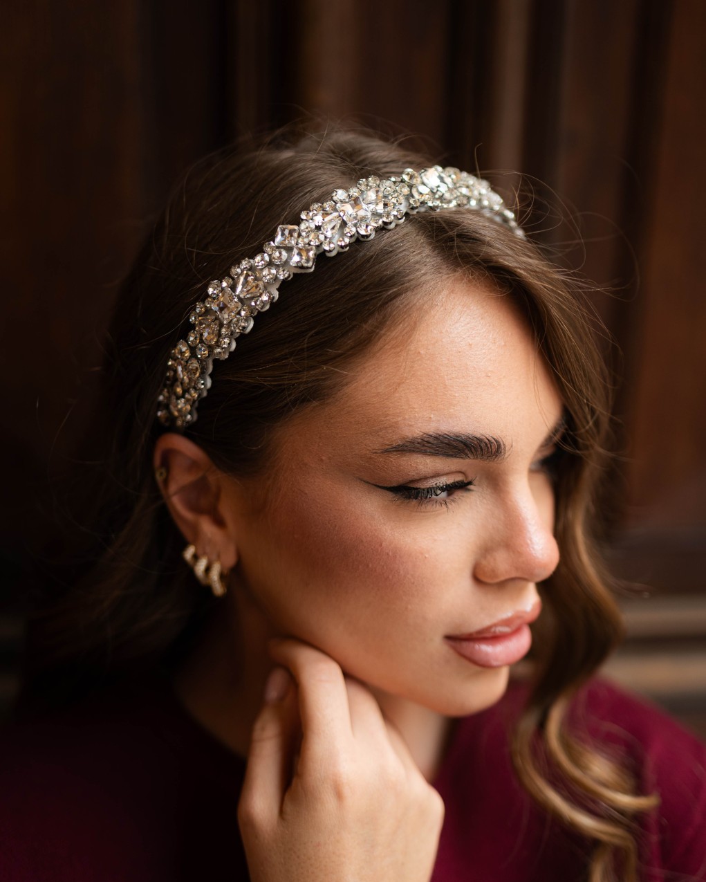 Cerchietto gioiello elegante dallo stile sofisticato, perfetto per occasioni speciali e cerimonie. Caratterizzato da un'elaborata decorazione centrale con cristalli e strass incastonati, che creano un effetto luminoso e prezioso. Realizzato con base rigida rivestita per una tenuta ottimale, garantisce comfort durante tutto l'utilizzo. La vestibilità è universale grazie alla struttura ergonomica che si adatta comodamente alla forma del capo.