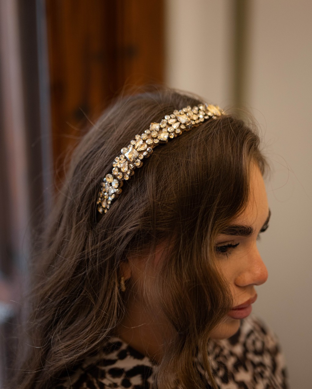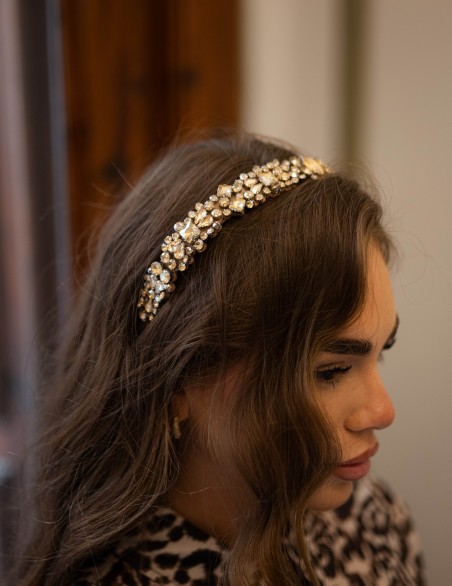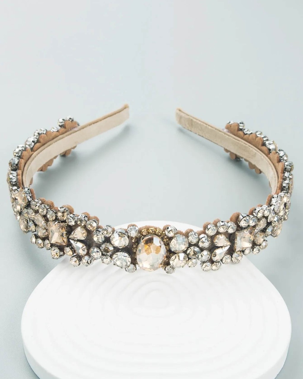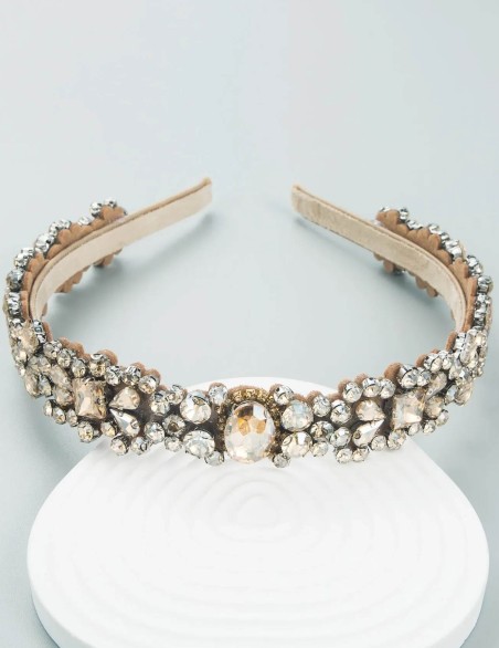Cerchietto gioiello elegante dallo stile sofisticato, perfetto per occasioni speciali e cerimonie. Caratterizzato da un'elaborata decorazione centrale con cristalli e strass incastonati, che creano un effetto luminoso e prezioso. Realizzato con base rigida rivestita per una tenuta ottimale, garantisce comfort durante tutto l'utilizzo. La vestibilità è universale grazie alla struttura ergonomica che si adatta comodamente alla forma del capo.