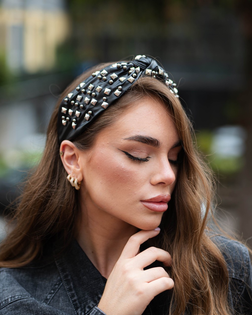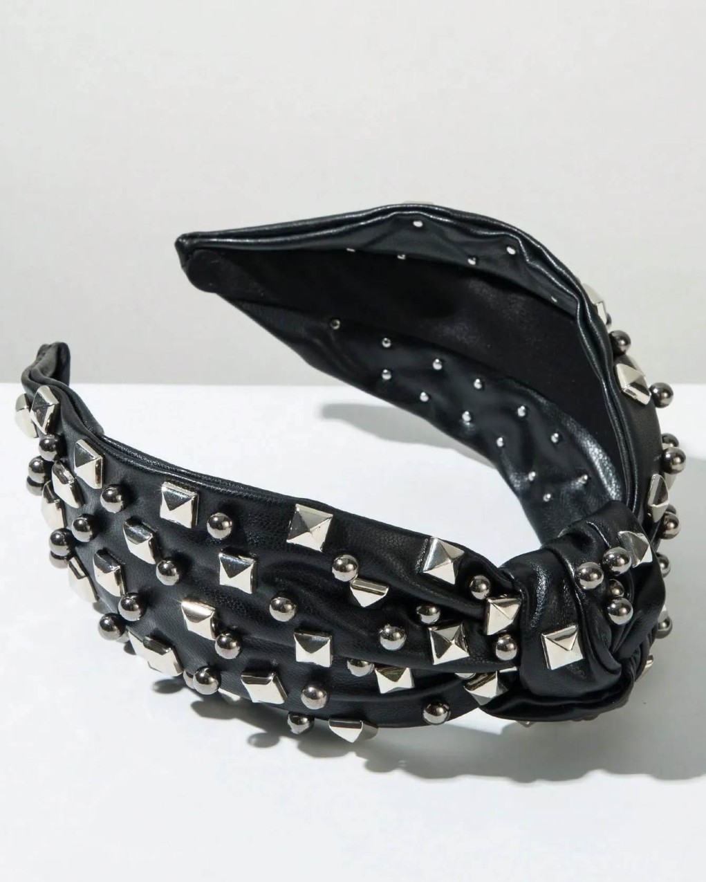 Cerchietto imbottito in ecopelle con decorazioni borchiate in stile rock-glam. La struttura larga e anatomica garantisce comfort e stabilità, mentre i dettagli metallici pyramid studs e mini borchie creano un raffinato effetto tridimensionale. Accessorio statement perfetto per aggiungere un tocco di carattere a qualsiasi outfit.