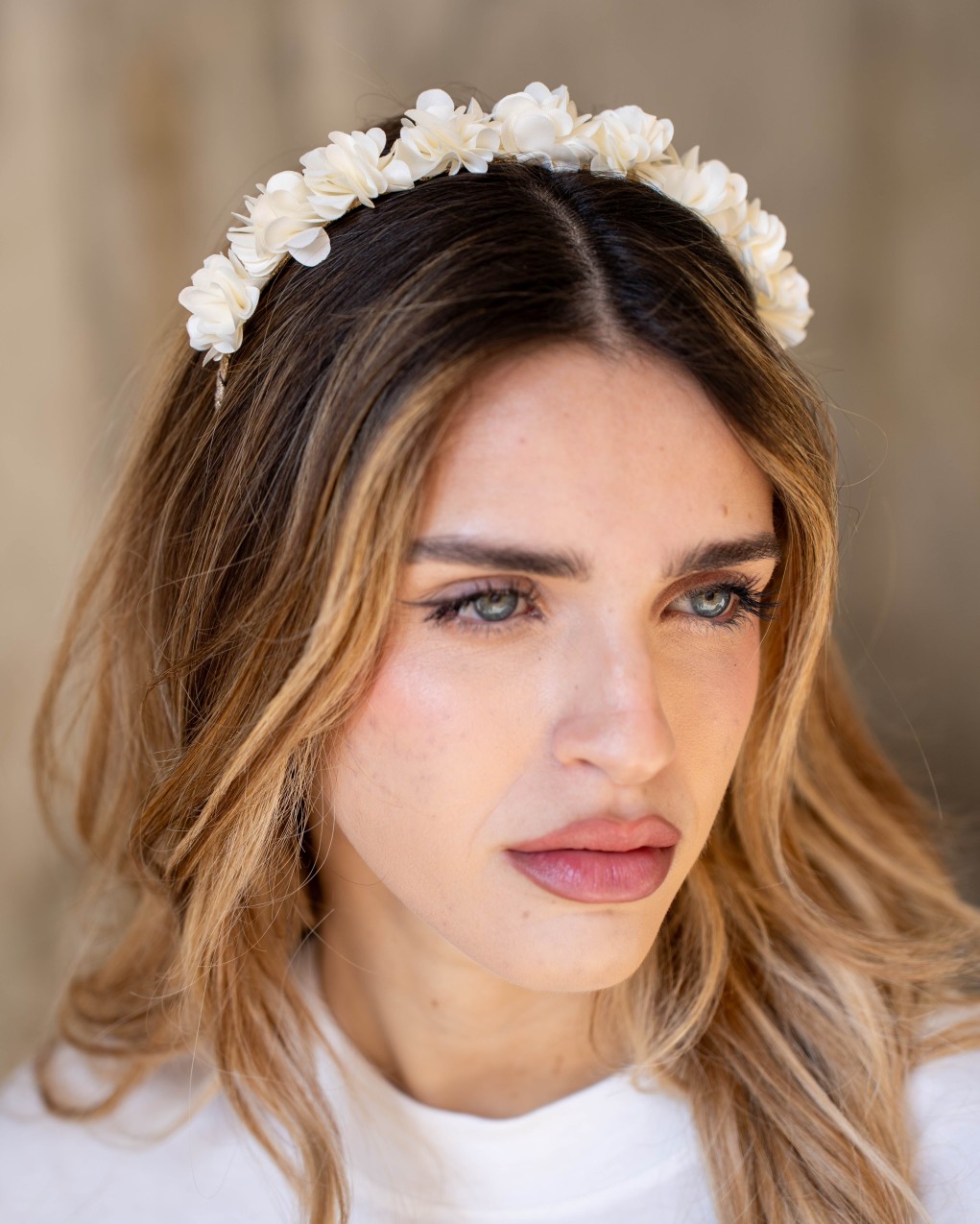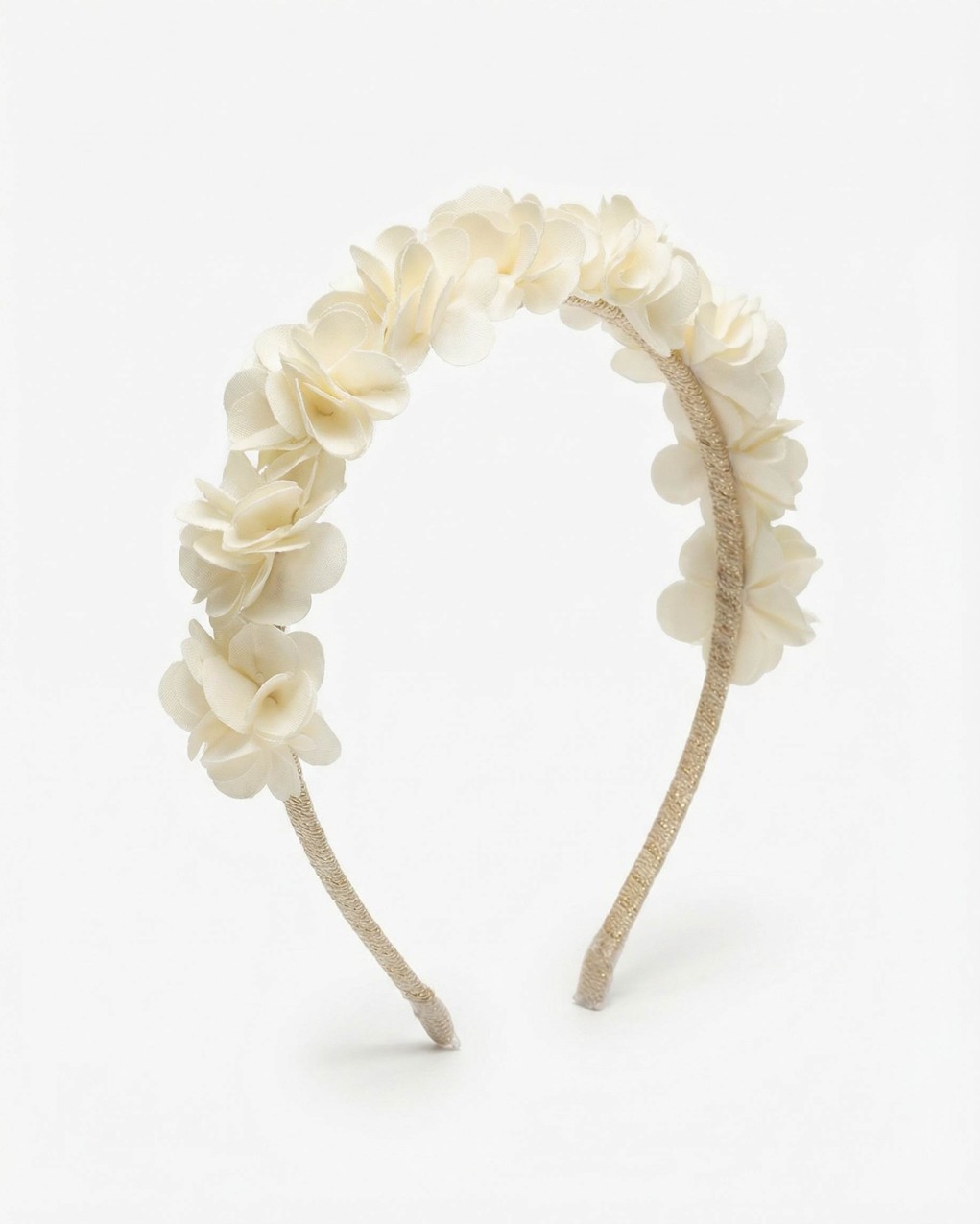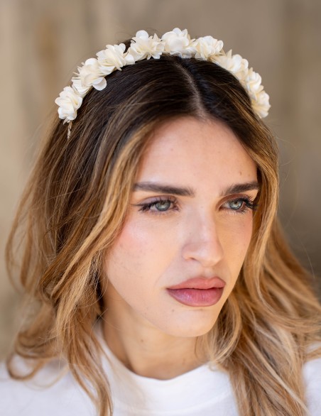 Cerchietto floreale dallo stile romantico ed elegante, perfetto per cerimonie e occasioni speciali. Realizzato con delicati fiori in tessuto disposti uniformemente lungo tutta la struttura, garantisce un look sofisticato e femminile. La base rigida assicura una vestibilità comoda e stabile, mantenendo la posizione per tutto il giorno. Accessorio versatile ideale per acconciature sia raccolte che sciolte.