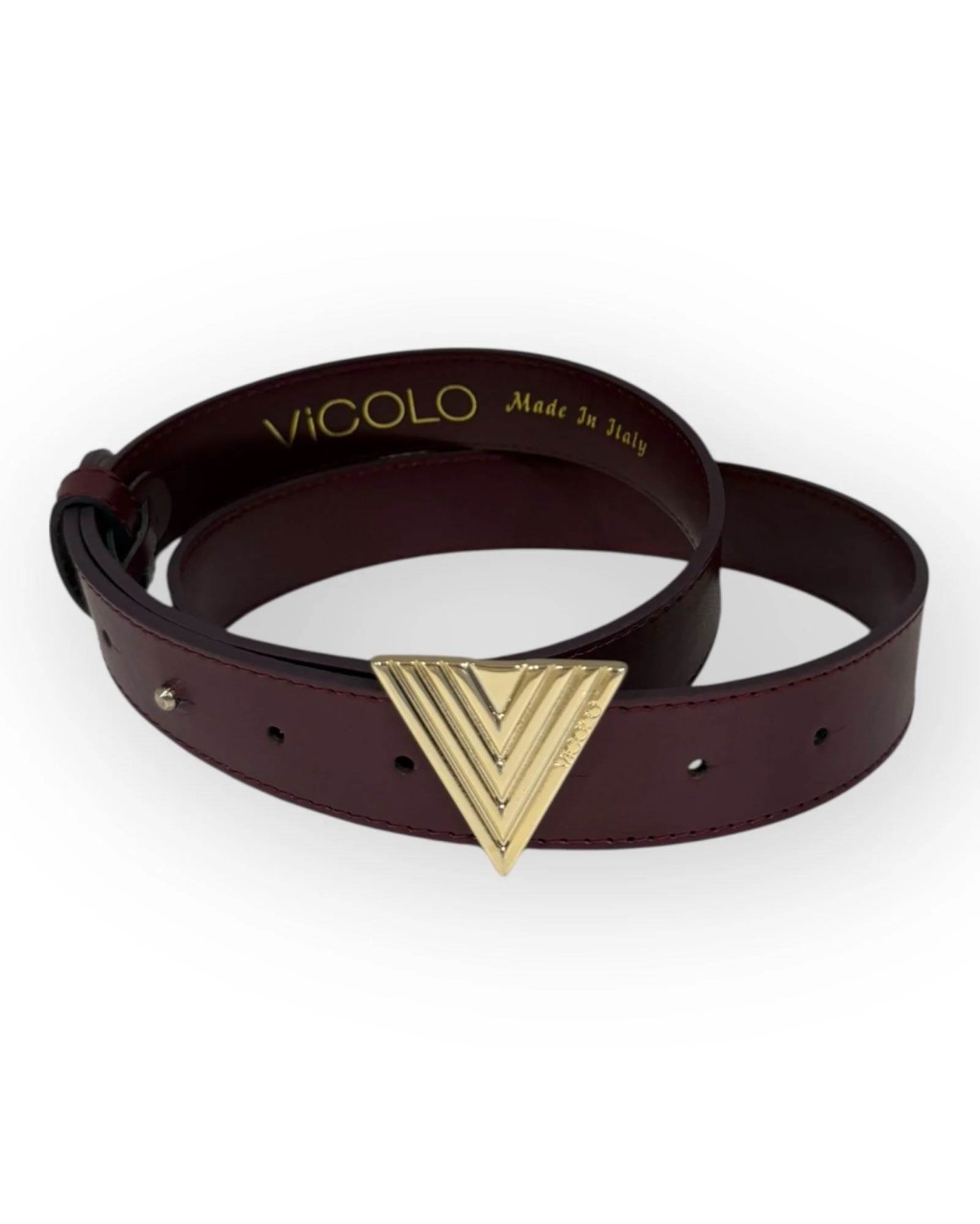 Cintura elegante Vicolo Made in Italy con distintiva fibbia triangolare in metallo dalla finitura dorata. Design contemporaneo caratterizzato da linee pulite e dettagli geometrici, ideale per impreziosire look casual e formali. La cintura presenta una costruzione robusta con cuciture precise e fori multipli per una vestibilità personalizzabile.