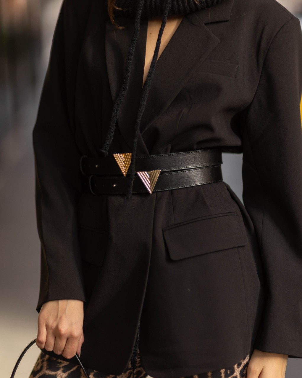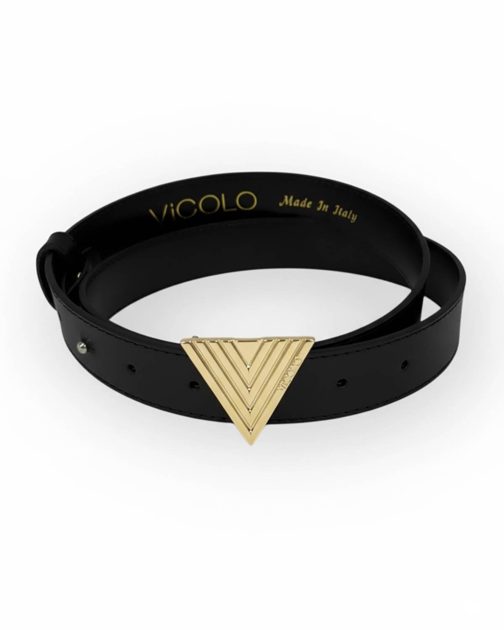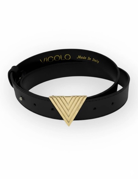 Cintura elegante Vicolo Made in Italy con distintiva fibbia triangolare in metallo dalla finitura dorata. Design contemporaneo caratterizzato da linee pulite e dettagli geometrici, ideale per impreziosire look casual e formali. La cintura presenta una costruzione robusta con cuciture precise e fori multipli per una vestibilità personalizzabile.