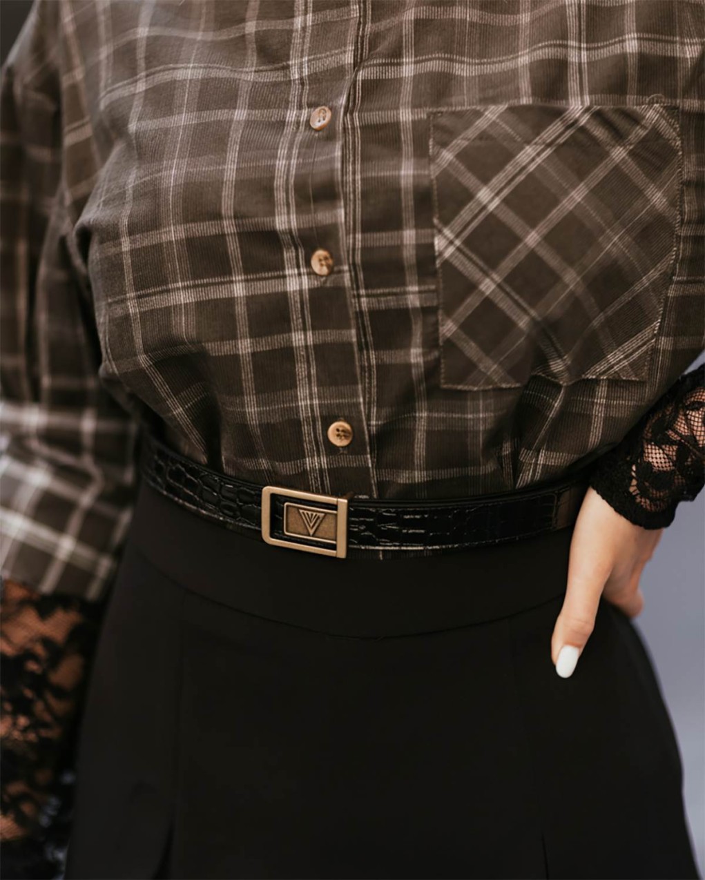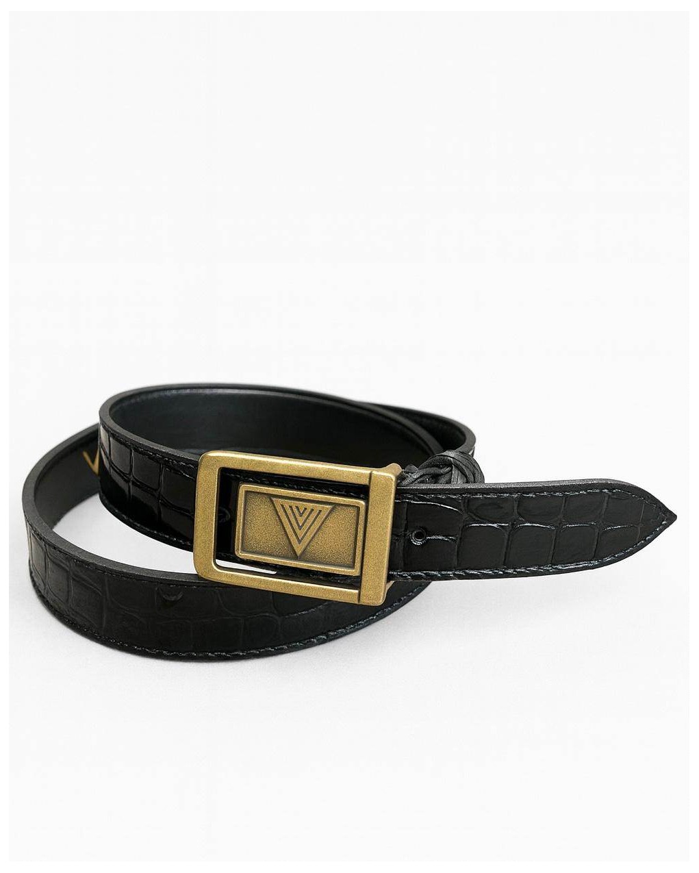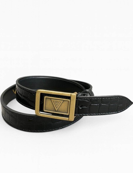 Elegante cintura in pelle con texture coccodrillo, impreziosita da una raffinata fibbia metallica con logo V. Questo accessorio versatile presenta una lavorazione di alta qualità e una chiusura regolabile per una vestibilità personalizzata. Il design classico e sofisticato si abbina perfettamente a look business e casual-chic.