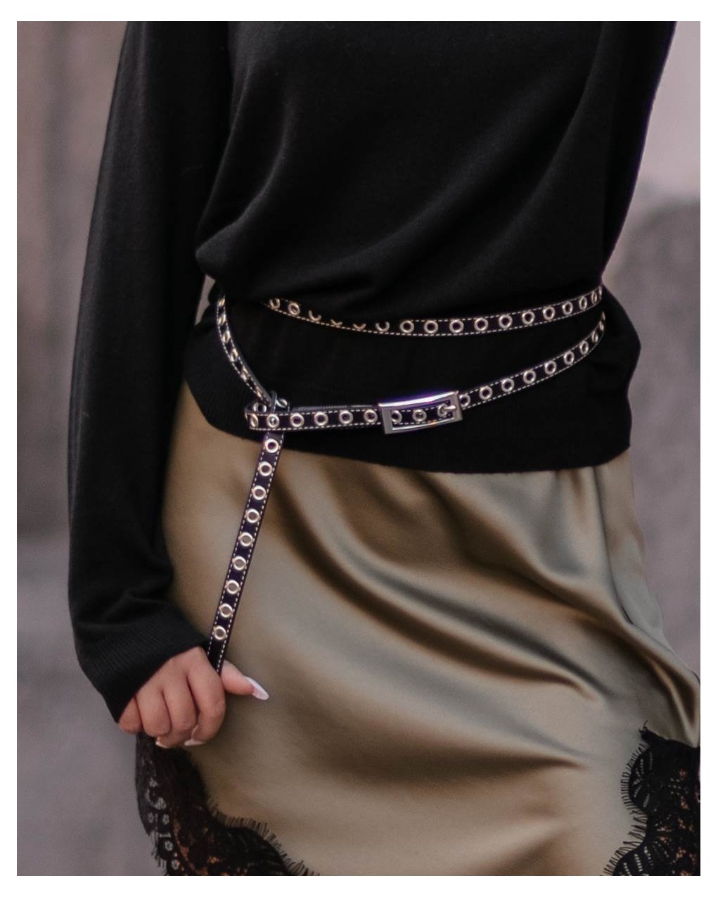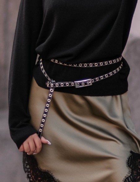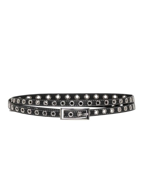 Cintura sottile in pelle con doppia fila di occhielli metallici, ideale per un look rock-chic contemporaneo. La fibbia rettangolare in metallo e le cuciture a contrasto donano un tocco di raffinatezza al design essenziale. Realizzata in vera pelle di alta qualità, si adatta perfettamente ai passanti dei jeans e può essere indossata sia a vita bassa che alta.