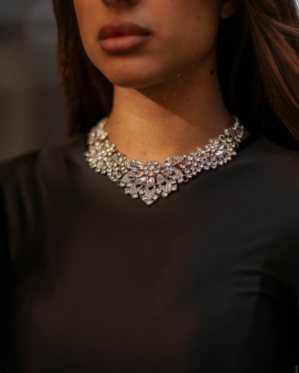 Collana statement dal design elegante e sofisticato, impreziosita da cristalli sfaccettati di diverse dimensioni disposti in un motivo floreale centrale. La struttura è realizzata in metallo con finitura lucida e presenta un'architettura multistrato che crea un effetto tridimensionale di grande impatto. Un accessorio versatile che aggiunge luminosità e raffinatezza a qualsiasi outfit.