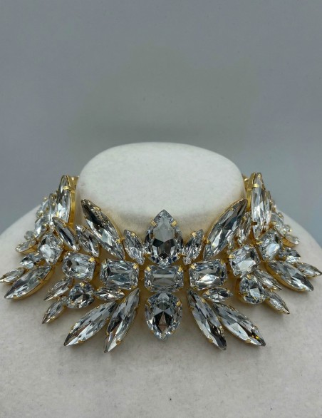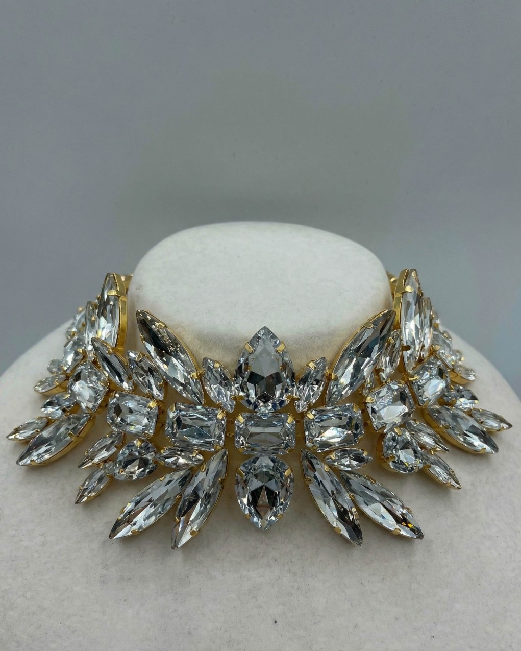 Collana girocollo dal design audace e scenografico, impreziosita da cristalli sfaccettati di diverse dimensioni disposti in una composizione geometrica a raggiera. Realizzata con pietre decorative in vetro e montatura in metallo, questa statement necklace presenta un effetto luminoso altamente rifrangente. La struttura rigida offre una vestibilità strutturata che valorizza la zona del décolleté, ideale per outfit eleganti e occasioni speciali.