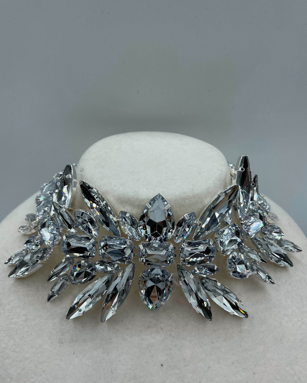 Collana girocollo dal design audace e scenografico, impreziosita da cristalli sfaccettati di diverse dimensioni disposti in una composizione geometrica a raggiera. Realizzata con pietre decorative in vetro e montatura in metallo, questa statement necklace presenta un effetto luminoso altamente rifrangente. La struttura rigida offre una vestibilità strutturata che valorizza la zona del décolleté, ideale per outfit eleganti e occasioni speciali.