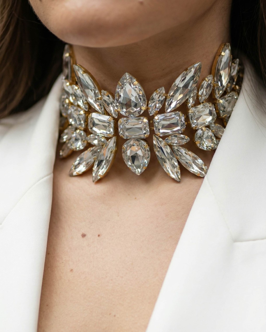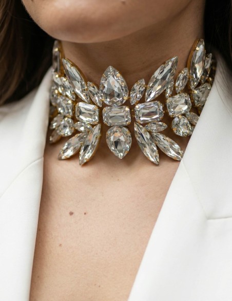 Collana girocollo dal design audace e scenografico, impreziosita da cristalli sfaccettati di diverse dimensioni disposti in una composizione geometrica a raggiera. Realizzata con pietre decorative in vetro e montatura in metallo, questa statement necklace presenta un effetto luminoso altamente rifrangente. La struttura rigida offre una vestibilità strutturata che valorizza la zona del décolleté, ideale per outfit eleganti e occasioni speciali.