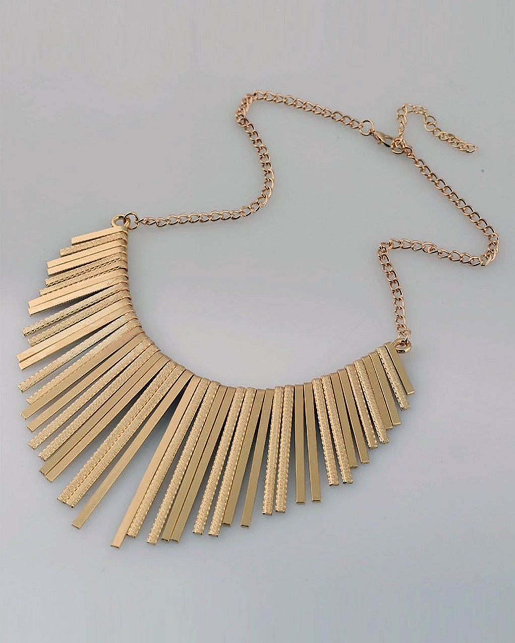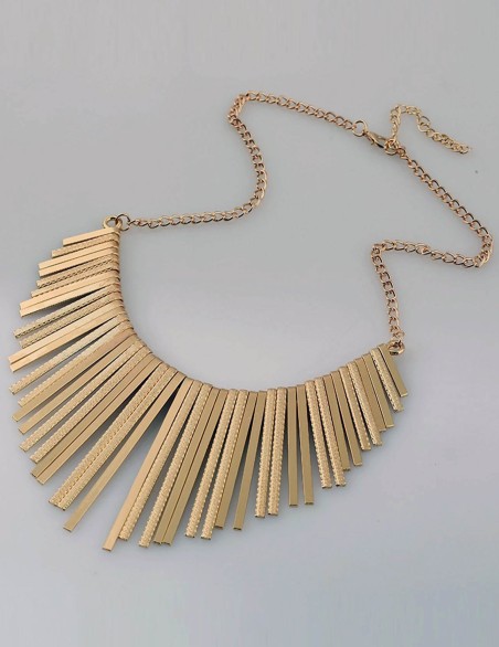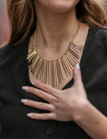 Collana dal design contemporaneo caratterizzata da una fila di pendenti metallici lineari disposti a ventaglio, che creano un effetto scenografico e sofisticato. Realizzata in lega metallica con finitura lucida, presenta barrette verticali di lunghezza graduale che seguono la linea della scollatura. La chiusura regolabile con catena sottile garantisce una vestibilità versatile, perfetta per impreziosire look casual ed eleganti. Accessorio statement ideale per chi cerca un gioiello d'impatto dal carattere moderno e audace.