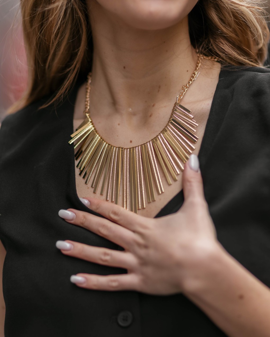 Collana dal design contemporaneo caratterizzata da una fila di pendenti metallici lineari disposti a ventaglio, che creano un effetto scenografico e sofisticato. Realizzata in lega metallica con finitura lucida, presenta barrette verticali di lunghezza graduale che seguono la linea della scollatura. La chiusura regolabile con catena sottile garantisce una vestibilità versatile, perfetta per impreziosire look casual ed eleganti. Accessorio statement ideale per chi cerca un gioiello d'impatto dal carattere moderno e audace.