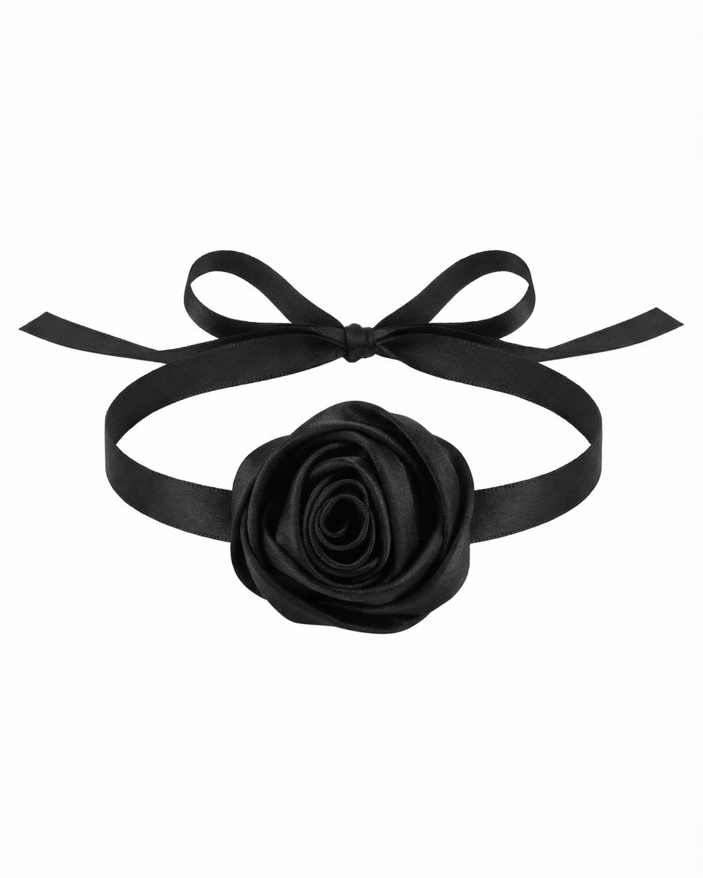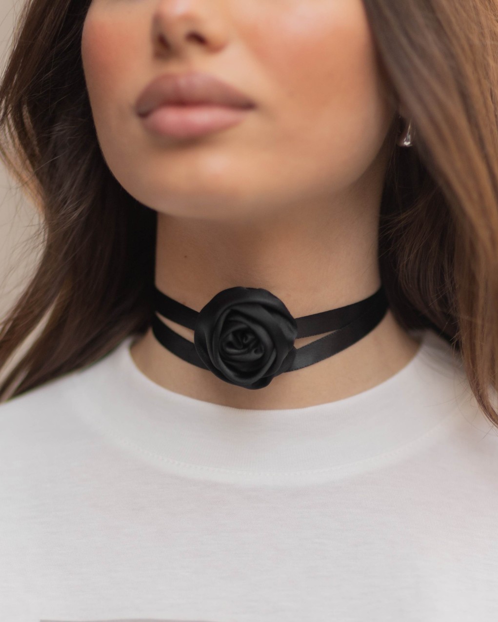 Elegante choker caratterizzato da una rosa decorativa artigianale realizzata con tecnica a spirale. Il pendente floreale è confezionato in raso lucido e montato su cordino regolabile che si adatta perfettamente al collo. Accessorio dallo stile romantico e femminile, ideale per impreziosire outfit casual ed eleganti. Chiusura regolabile per una vestibilità personalizzabile e confortevole.