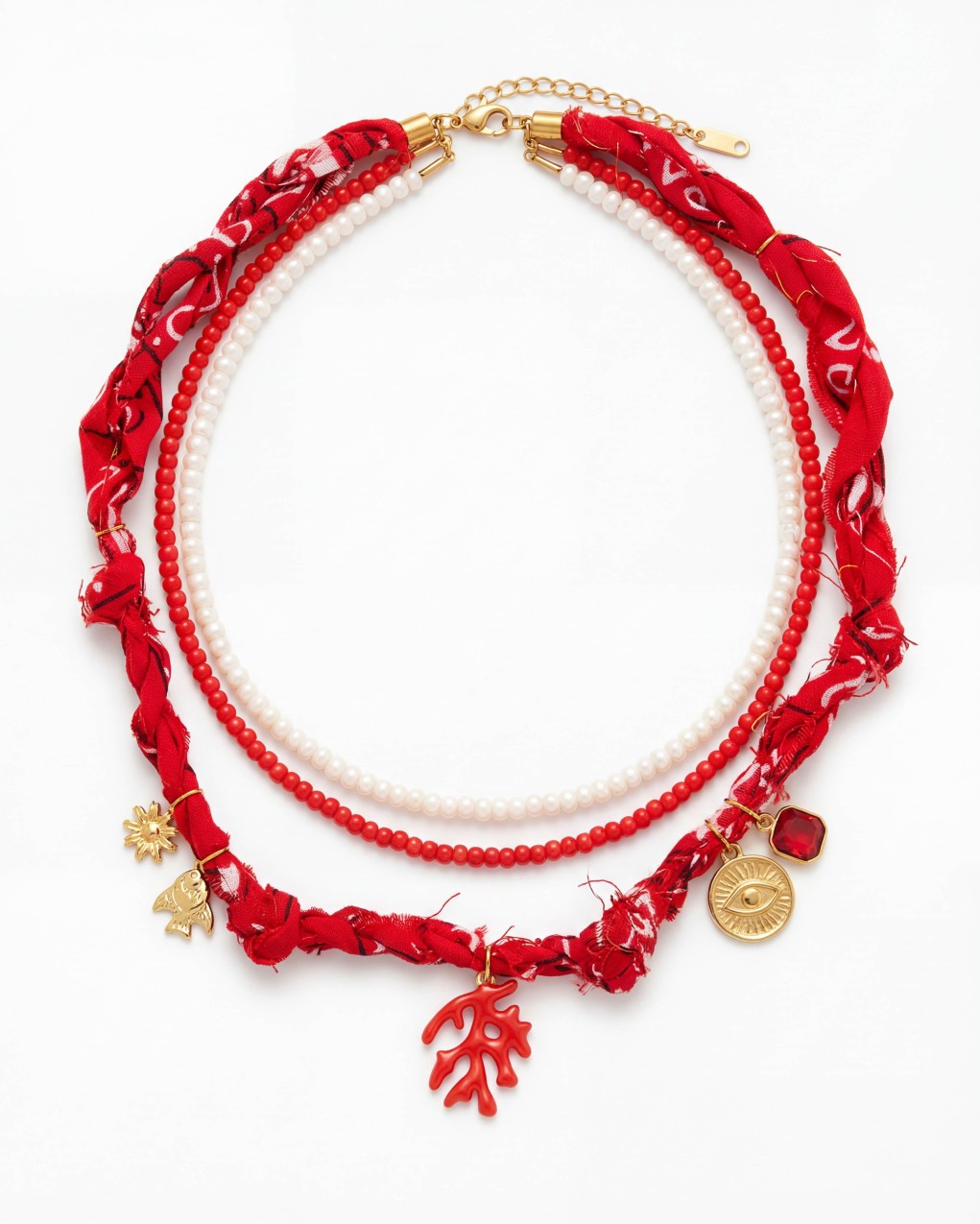 Set composto da tre collane layering in stile bohémien, perfette per creare un look stratificato di tendenza. Include una collana con perline delicate, una girocollo intrecciato con charm decorativi e una collana con ciondolo a foglia decorativa. Realizzate con materiali misti tra cui cordini intrecciati, perline e pendenti metallici, queste collane offrono una vestibilità regolabile per adattarsi a diverse lunghezze. Ideali da indossare insieme o singolarmente per un tocco bohémien versatile.