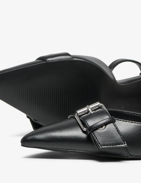 Elegante décolleté con punta affusolata e dettaglio fibbia decorativa sulla tomaia. Il cinturino alla caviglia regolabile con fibbia assicura una calzata perfetta, mentre il tacco a spillo da 9 cm conferisce un tocco di raffinata femminilità. Design minimal e contemporaneo ideale per outfit formali e da cerimonia.