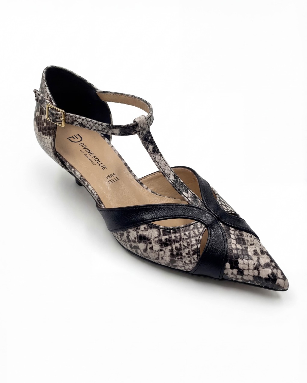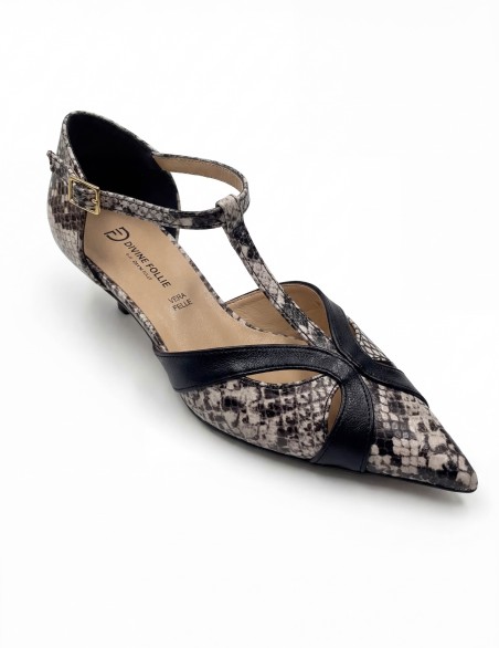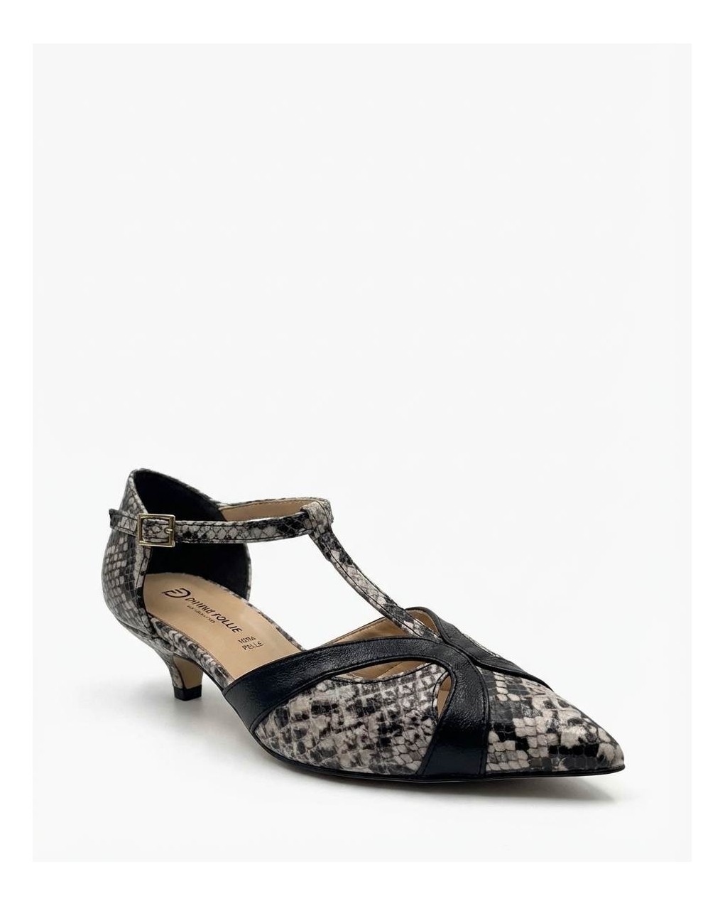 Elegante décolleté con cinturino a T e tacco basso kitten heel, perfetta per un look sofisticato e confortevole. Realizzata in materiale effetto pelle con dettagli a stampa animalier che donano carattere e personalità. La punta affusolata slancia la silhouette, mentre il cinturino regolabile alla caviglia garantisce una calzata sicura. Il tacco di altezza contenuta assicura comfort prolungato, ideale per l'ufficio o occasioni semi-formali.