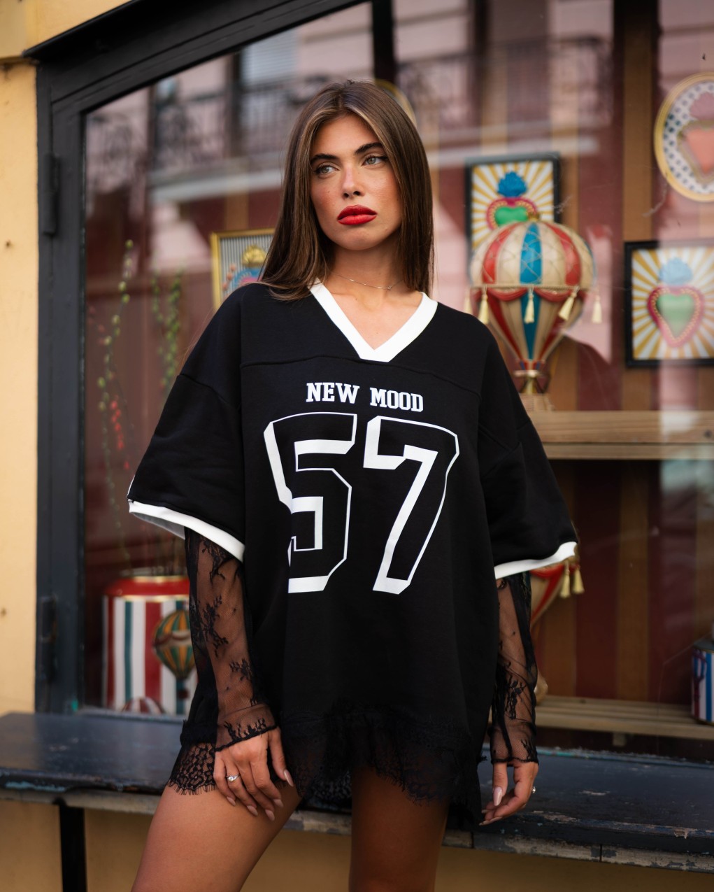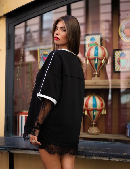 Felpa sportivo-elegante con raffinati dettagli in pizzo. Realizzato in morbido tessuto con profili a contrasto e maniche corte dal taglio over. La sovrapposizione di pizzo prezioso sul fondo e sulle maniche lunghe crea un originale effetto layering, perfetto per un look versatile dal giorno alla sera.