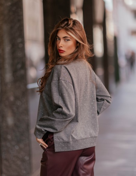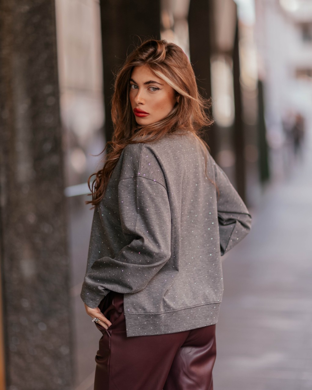 Felpa corta da donna in morbido tessuto di cotone con dettagli gioiello applicati su tutta la superficie per un tocco glamour. Il design presenta girocollo classico, maniche lunghe e orlo ribattuto, ideale per uno stile casual-chic contemporaneo. La vestibilità è regular fit leggermente accorciata, perfetta da abbinare a pantaloni a vita alta o gonne per un look moderno e raffinato.
