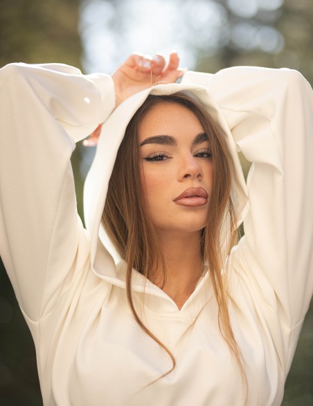 felpa con cappuccio crop. Il capo si distingue per gli inserti in pizzo floreale sul fondo della felpa, che creano un raffinato contrasto tra comfort casual e femminilità.