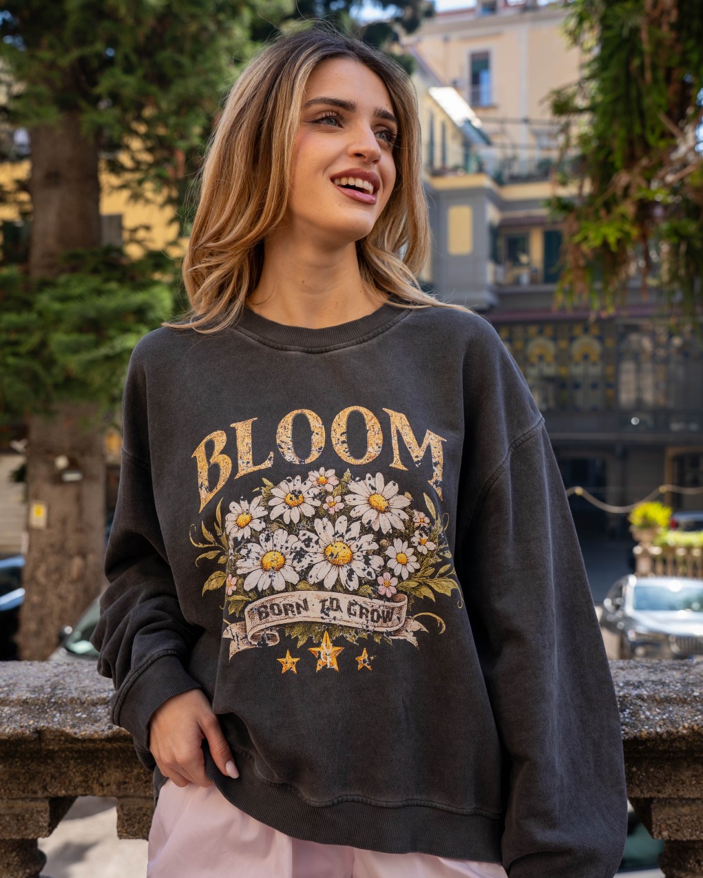 Felpa girocollo dallo stile casual e contemporaneo, caratterizzata da una grafica floreale con scritta "BLOOM" e slogan motivazionale. Realizzata in morbido cotone felpato, presenta maniche lunghe con polsini elasticizzati e orlo a costine per una vestibilità confortevole. Il taglio regular e la texture morbida garantiscono libertà di movimento e versatilità d'uso, ideale per outfit quotidiani rilassati. Capo essenziale per completare il guardaroba con un tocco di carattere e comfort.