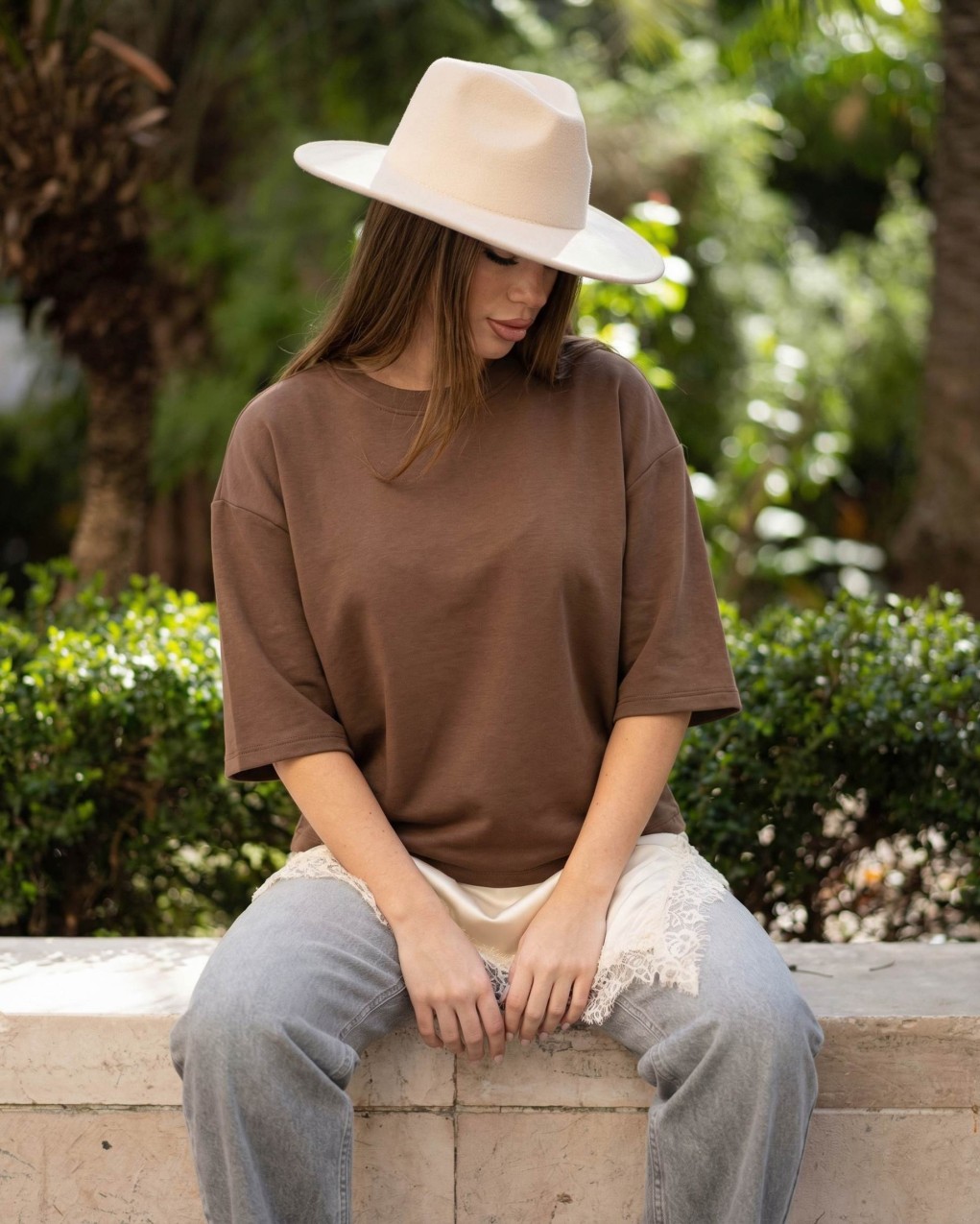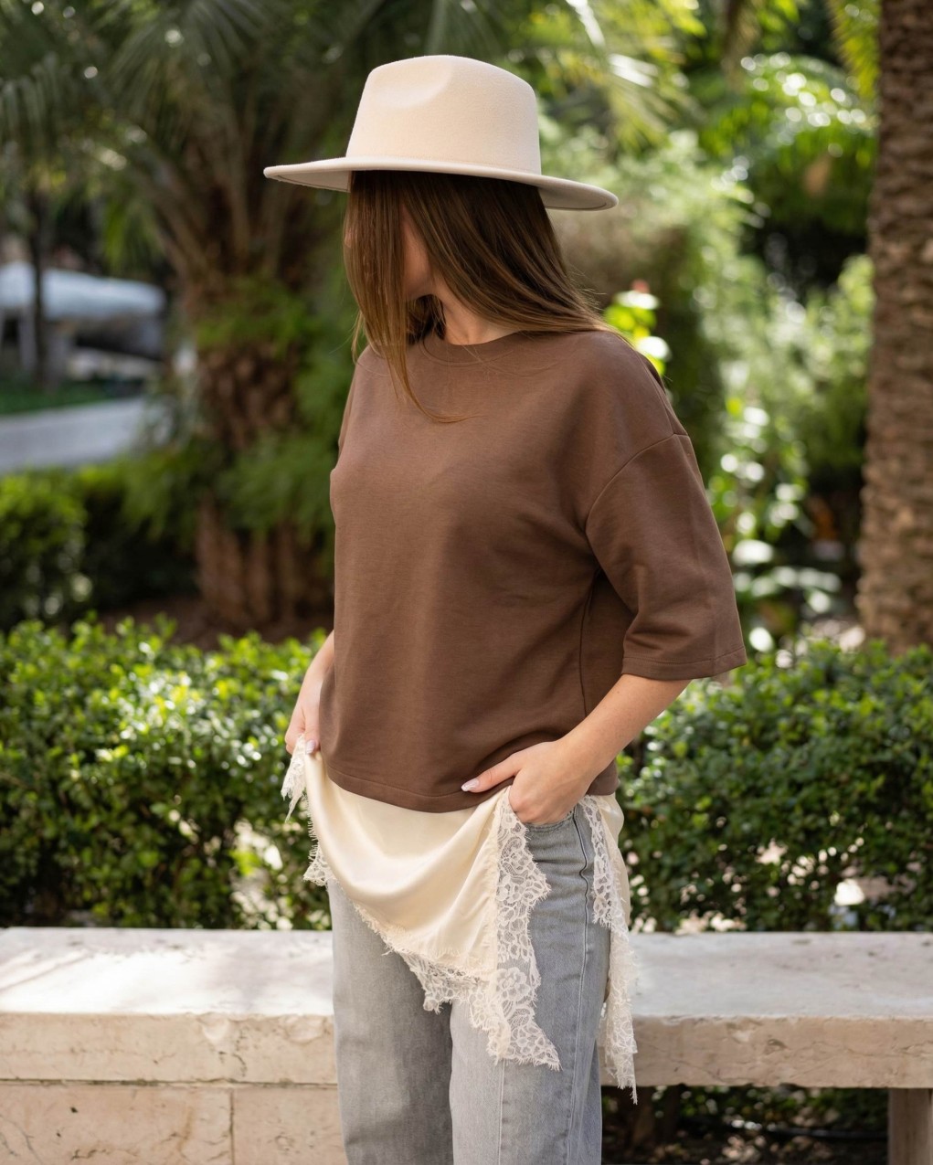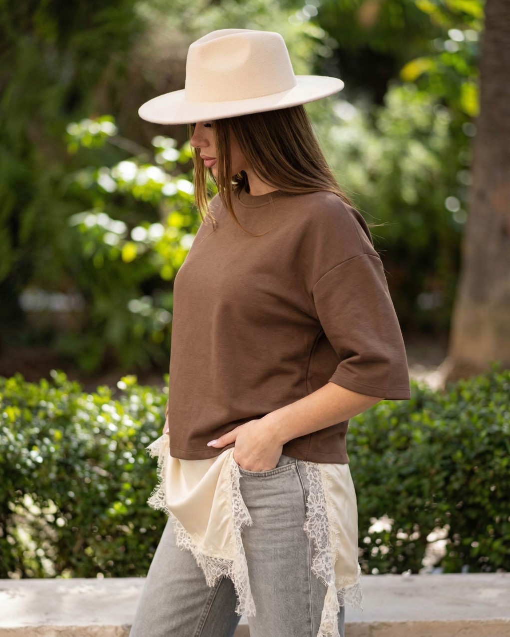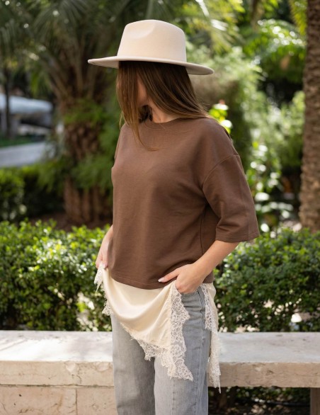 felpa leggera in morbido cotone dal design contemporaneo e minimalista doppiata con effetto lingere con bordo in pizzo