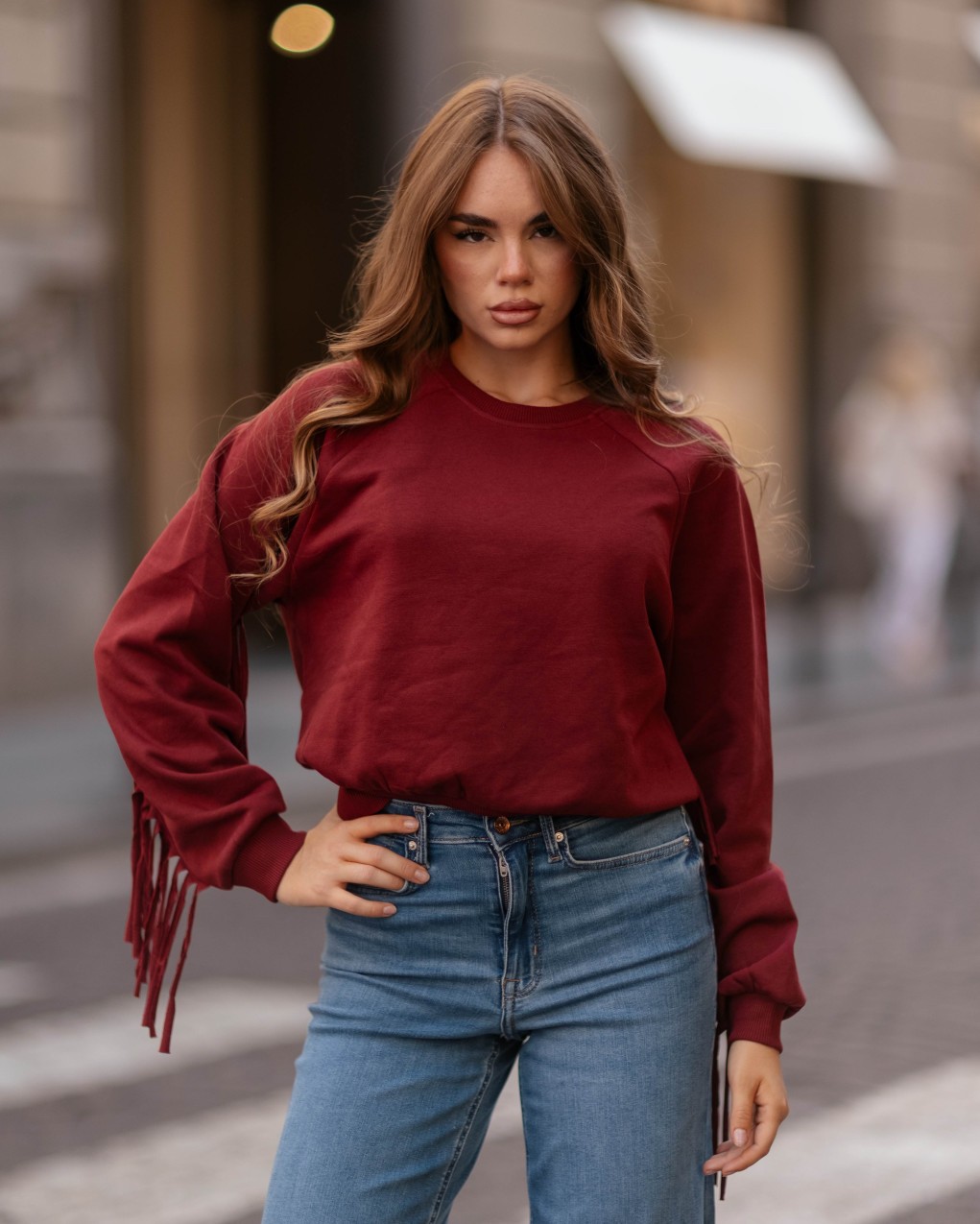 Felpa dal taglio moderno con dettagli a frange laterali che donano un tocco distintivo e originale. Realizzata in morbido cotone di alta qualità, presenta polsini e bordo elasticizzati per una vestibilità comoda e avvolgente. Il design essenziale e contemporaneo la rende perfetta per look casual ma ricercati.