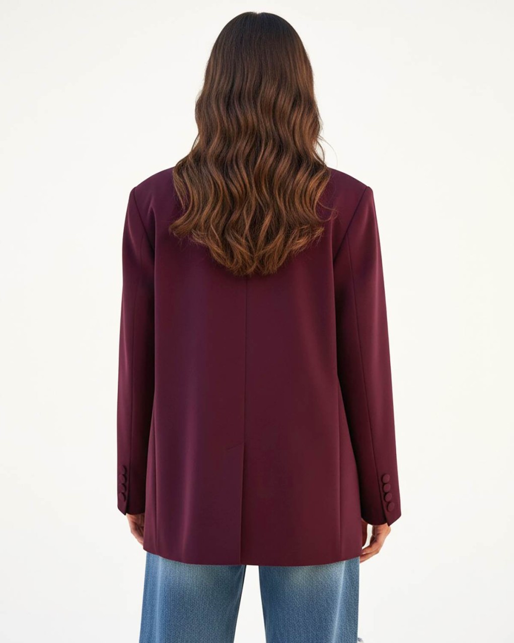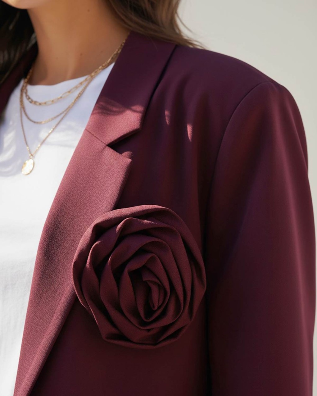 Blazer over con collo a revers e maniche lunghe con bottoni sul polso. Tasche frontali a filetto e spacchi posteriori. Chiusura sul davanti un bottone. Dettaglio spilla removibile in tessuto a forma di rosa.